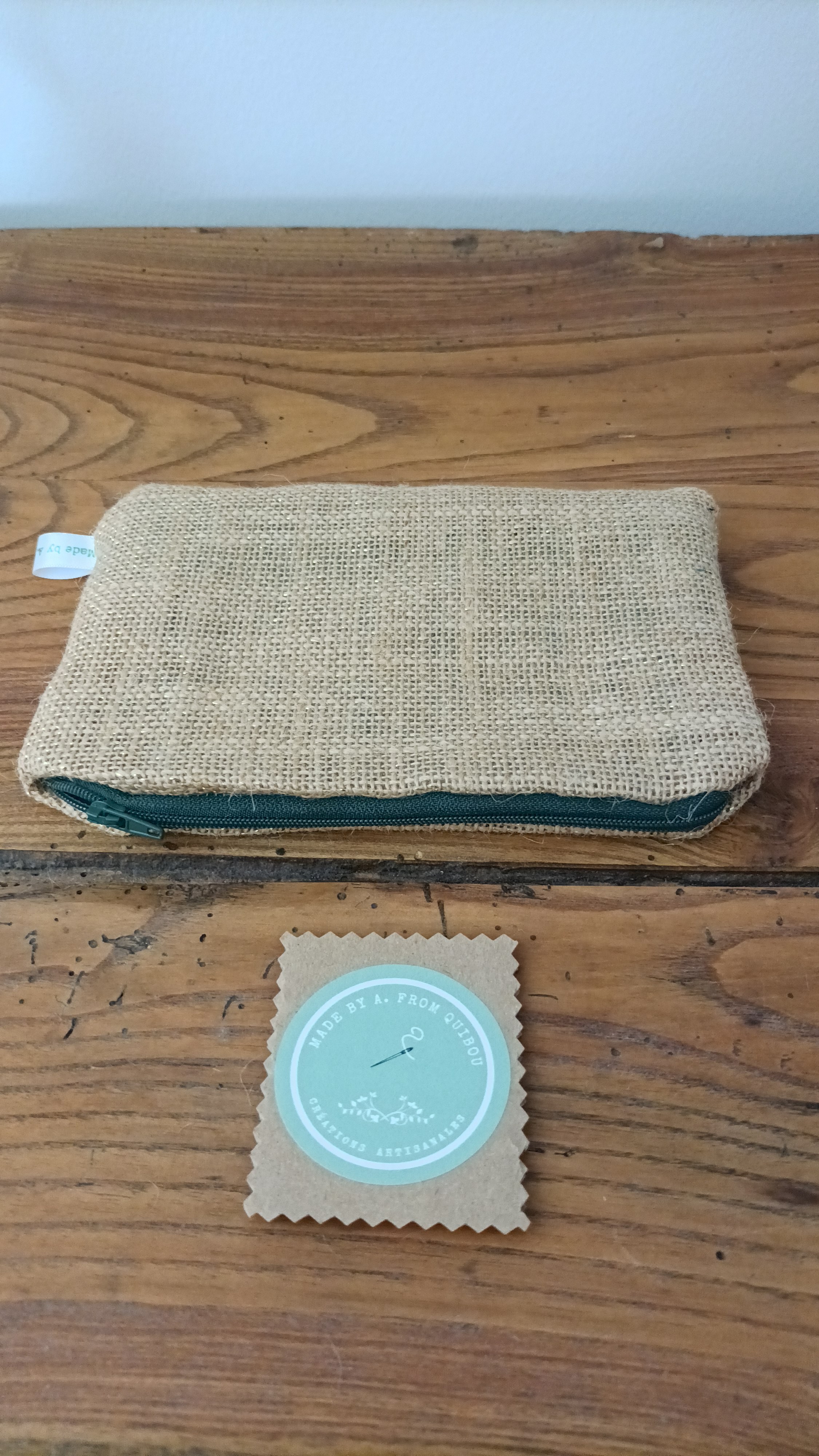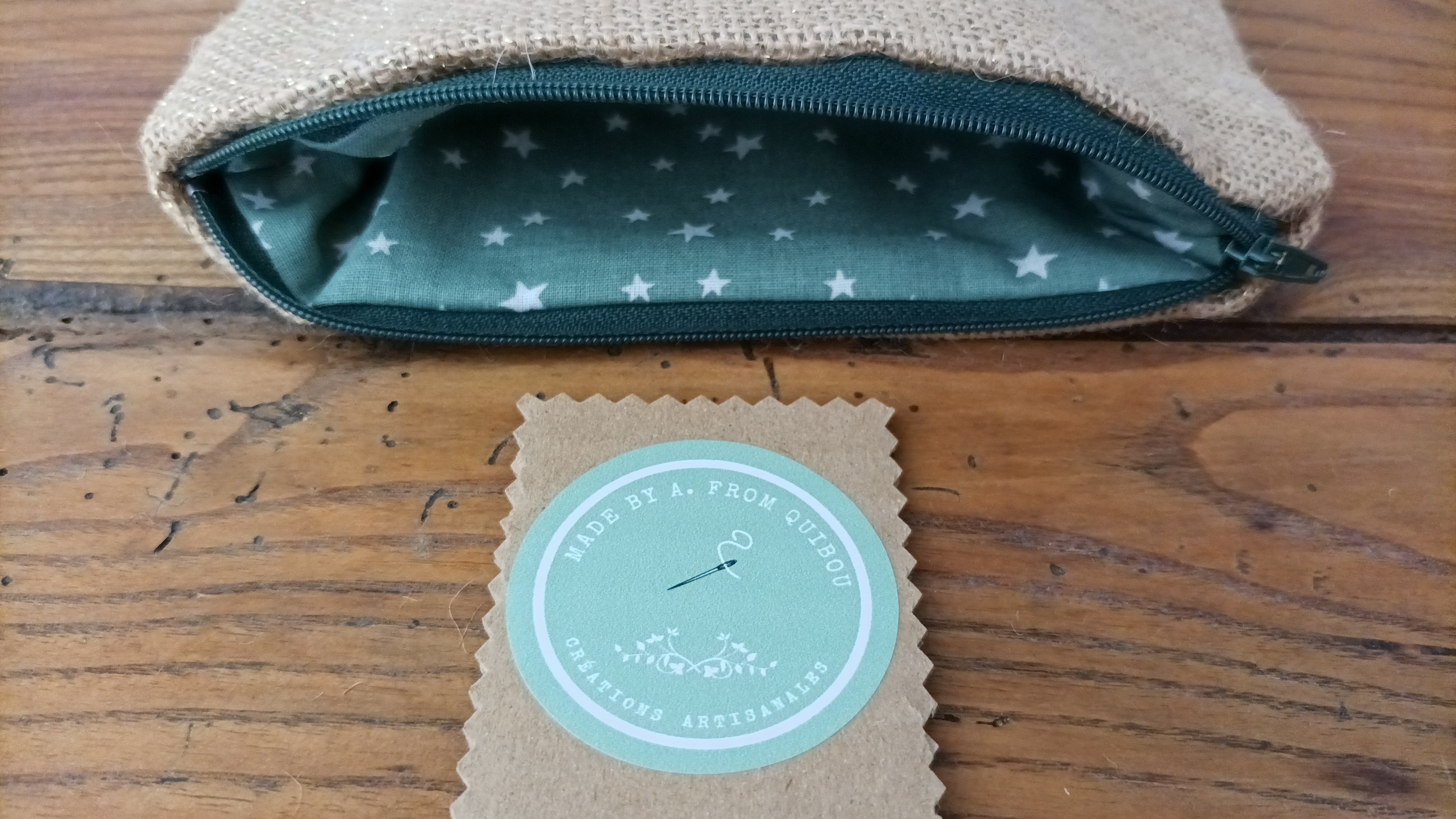 Trousse en toile de jute pailletée munie d'une fermeture éclair couleur vert sapin - Tissu intérieur 100% coton kaki certifié Oeko-tex