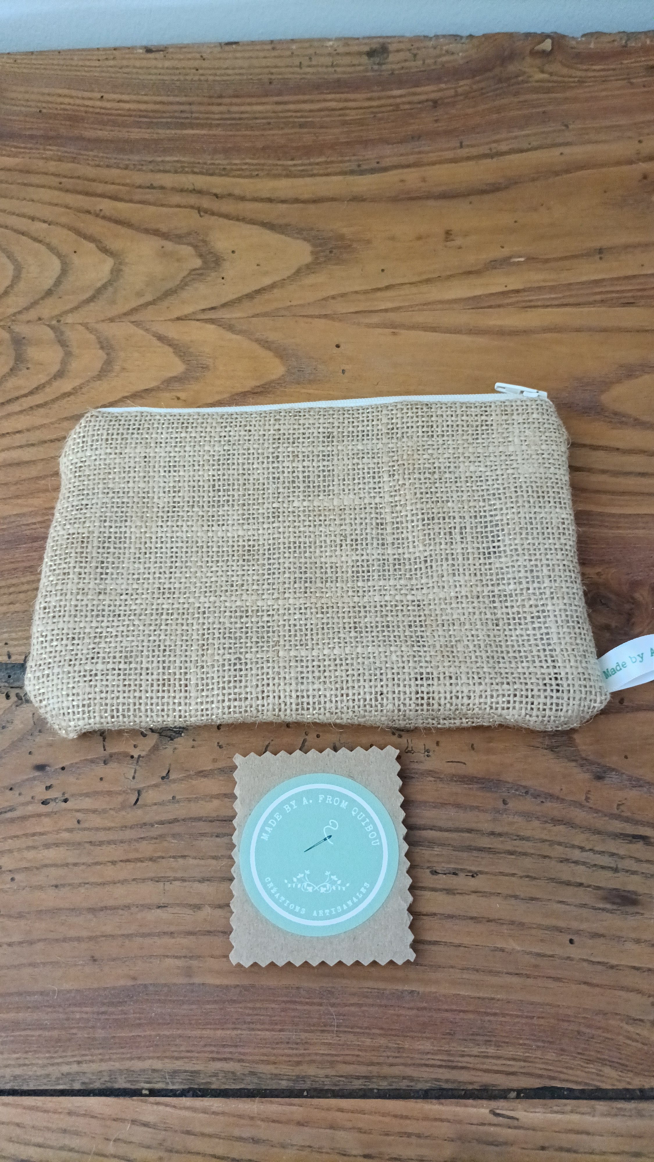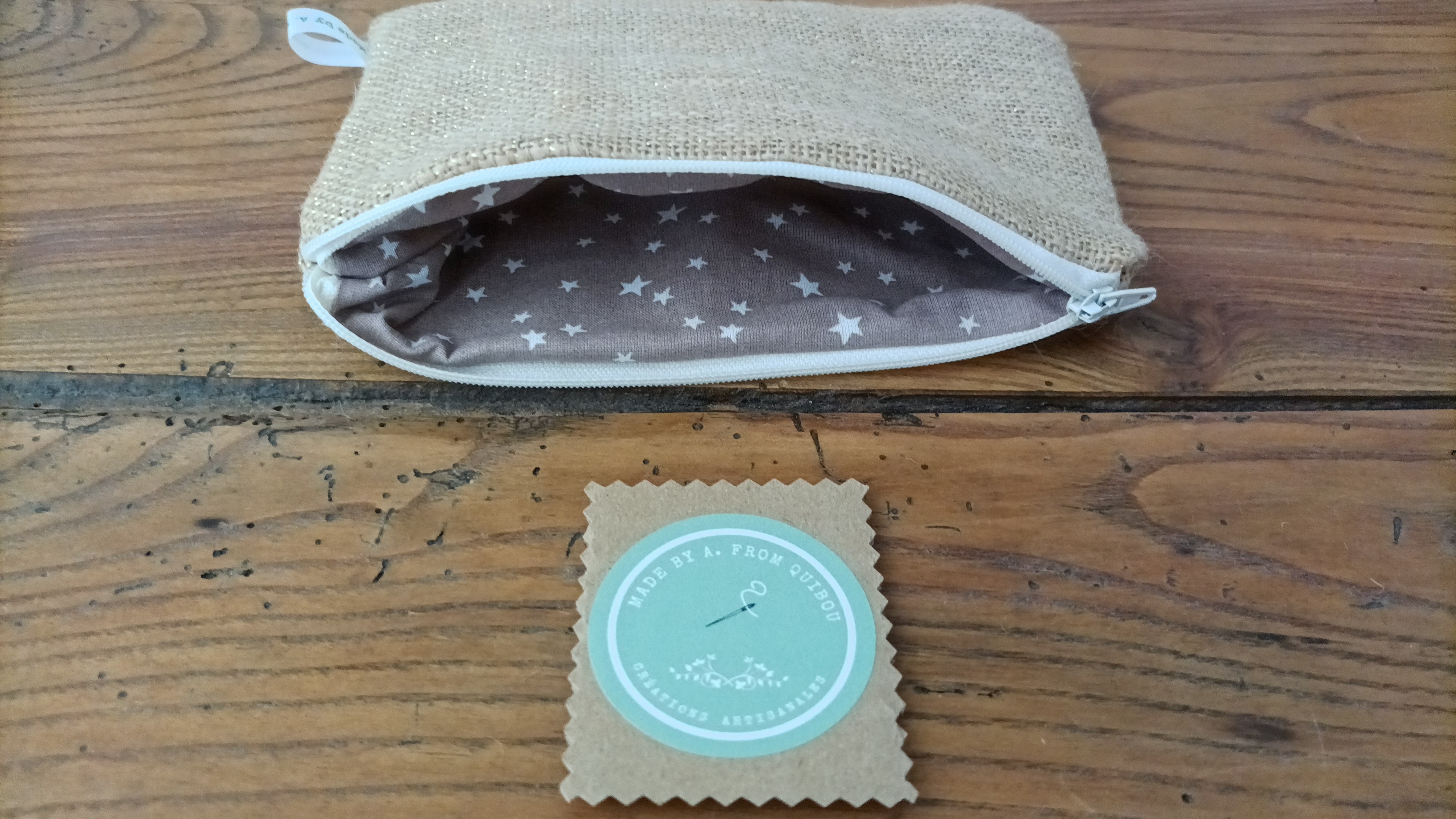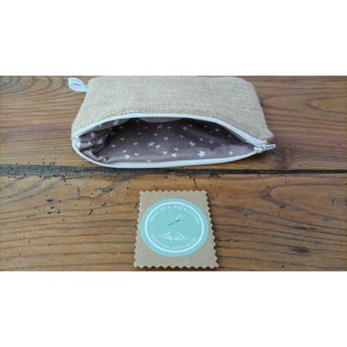 Trousse en toile de jute pailletée munie d'une fermeture éclair couleur écru - Tissu intérieur 100% coton taupe certifié Oeko-tex