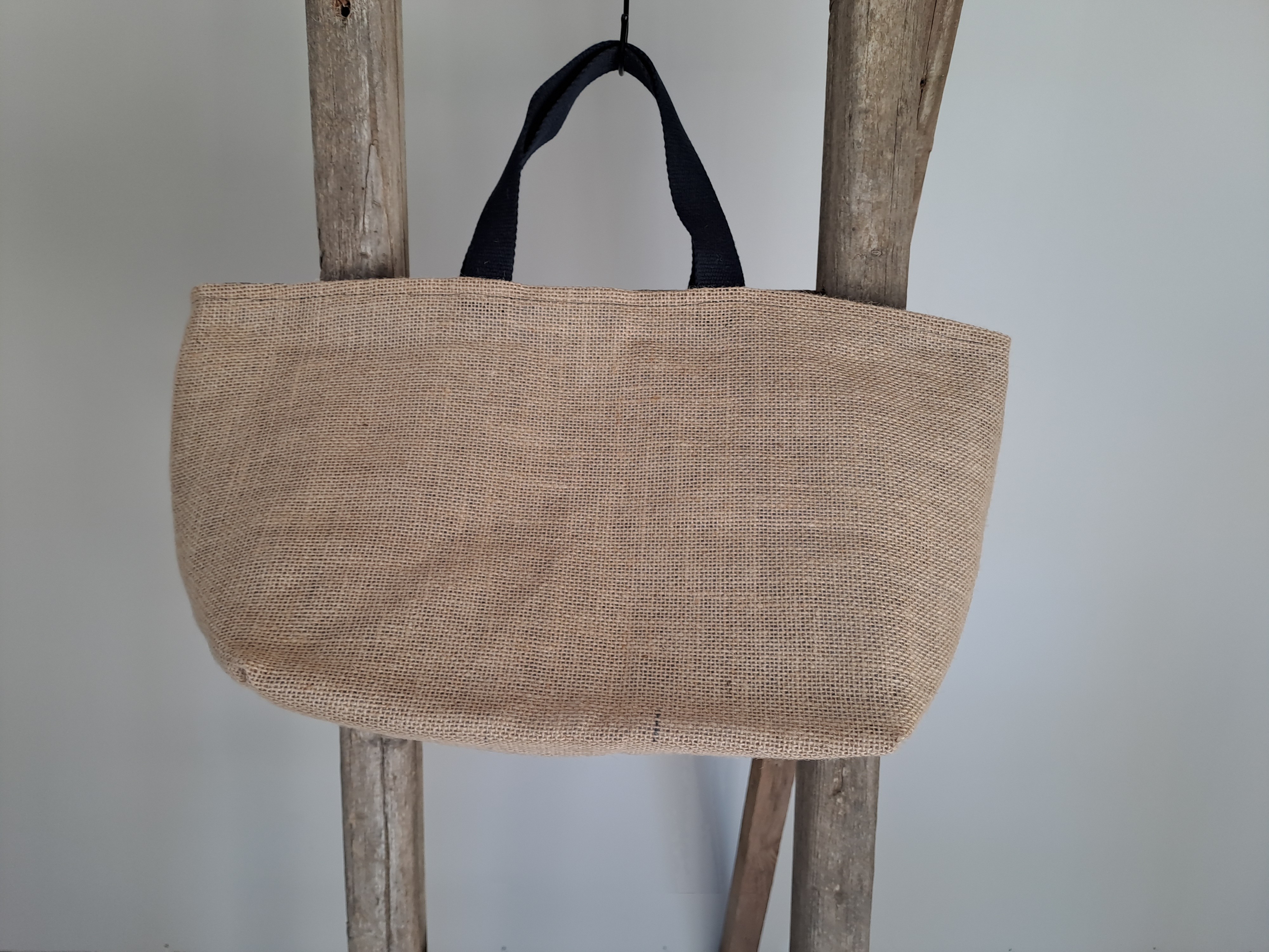 Cabas en toile de jute et tissu intérieur bleu marine à pois blancs certifié Oeko-tex