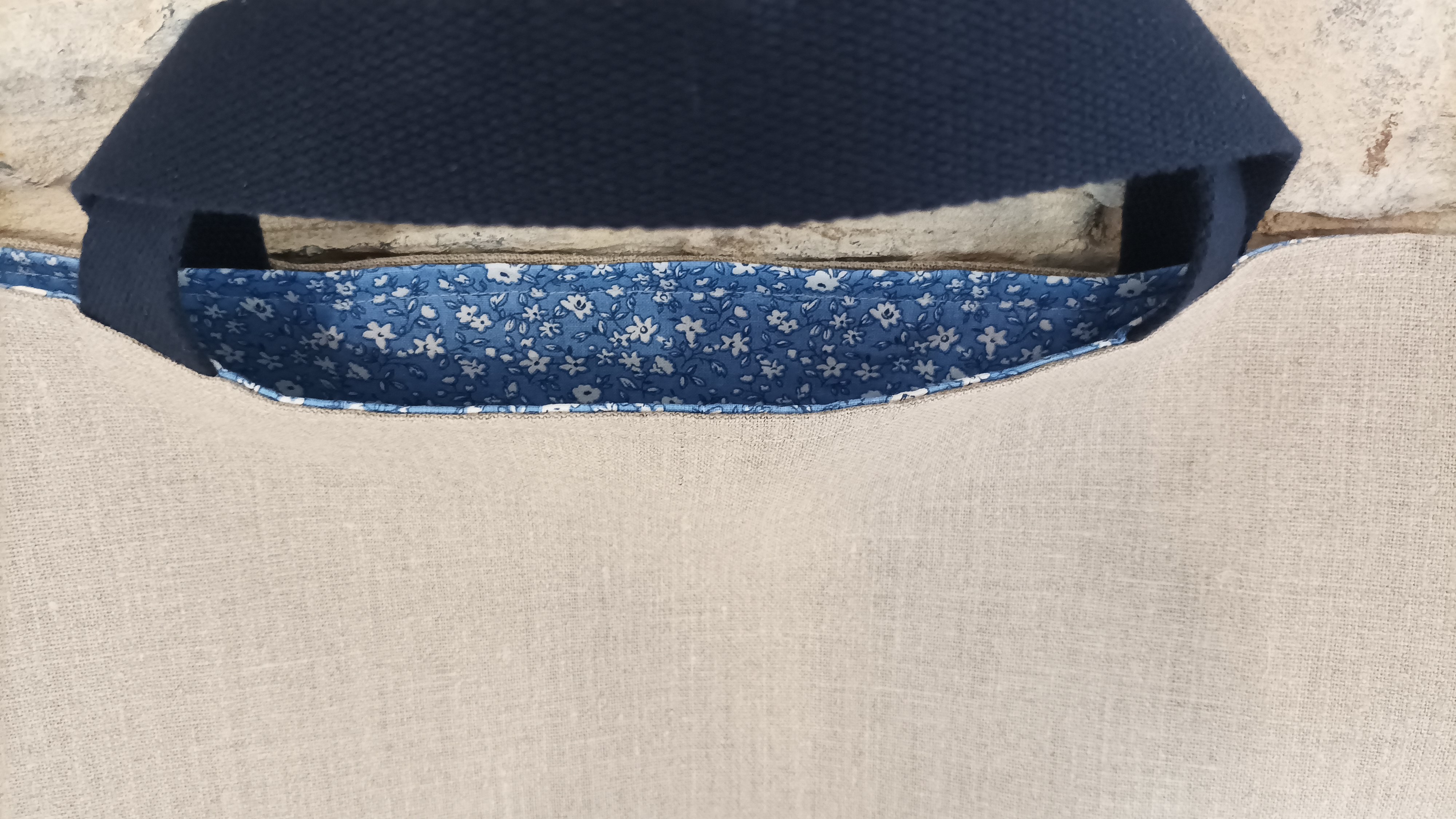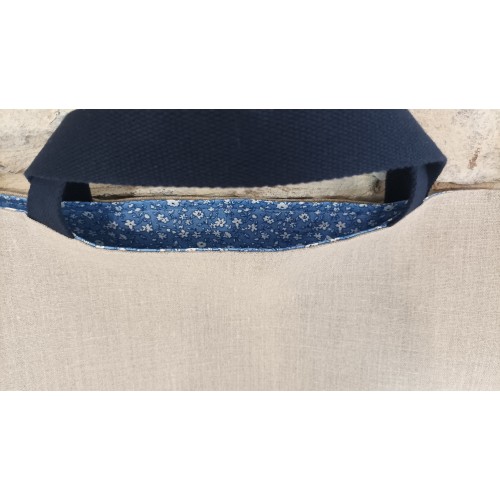 Grand Ca'bois brodé en lin d'origine française et tissu liberty fleurs blanches fond bleu certifié Oeko-tex