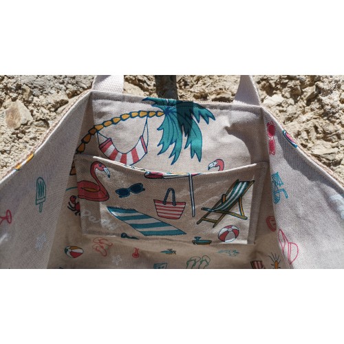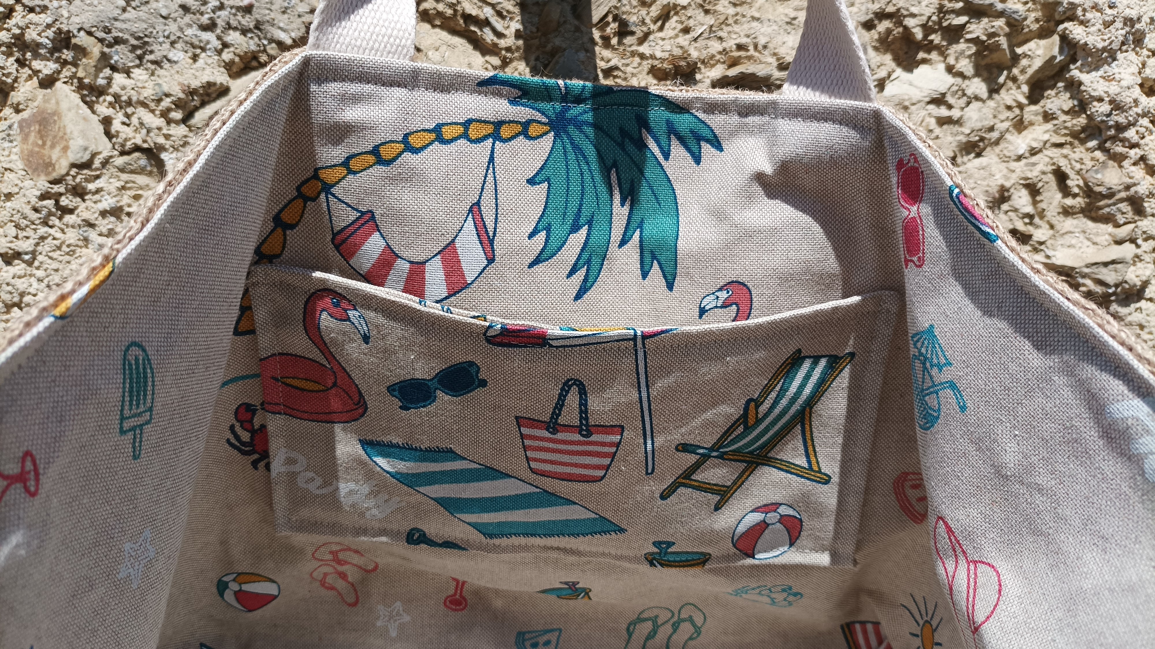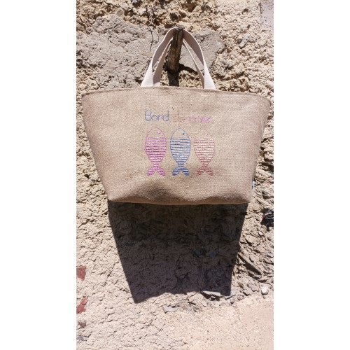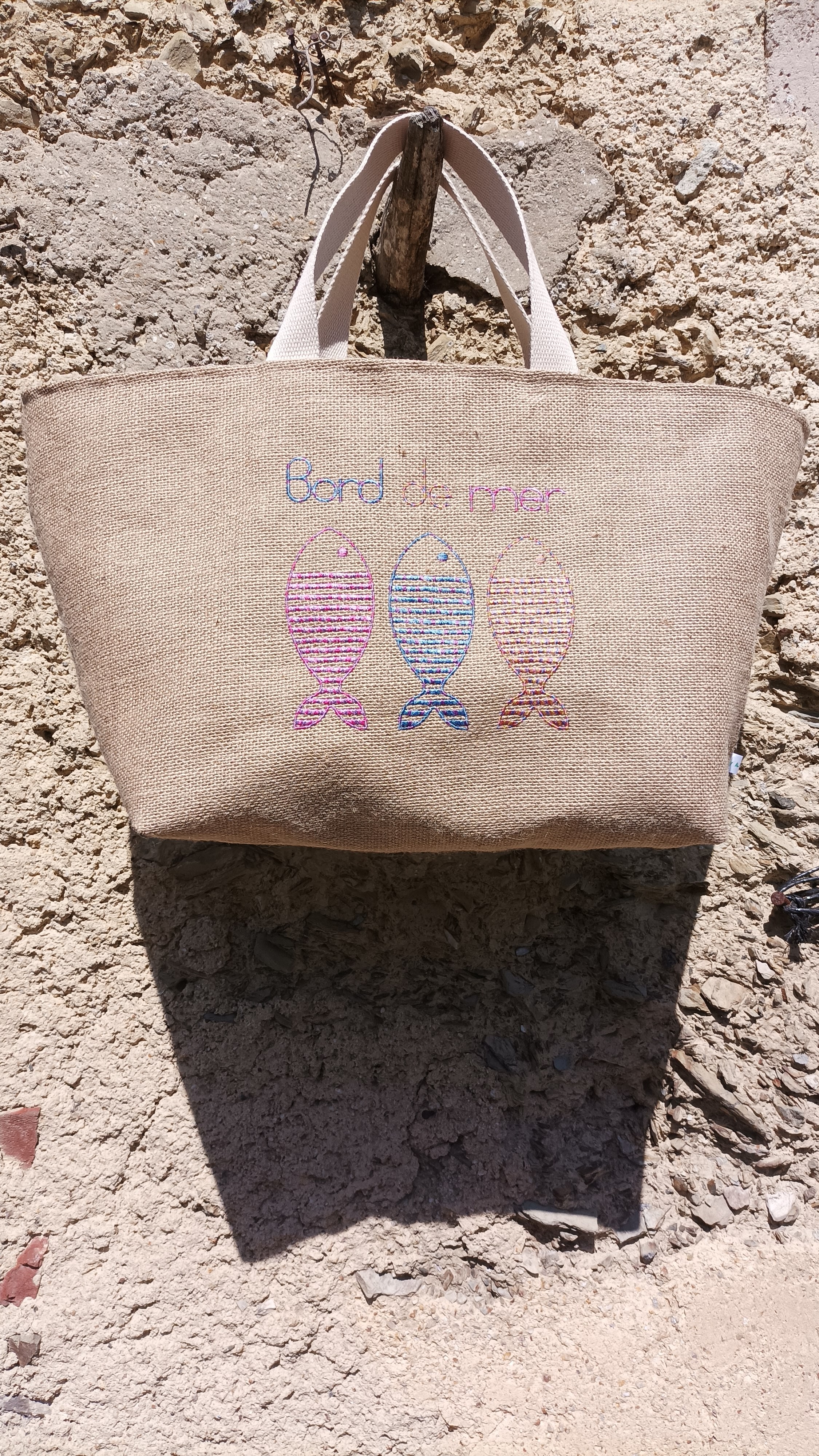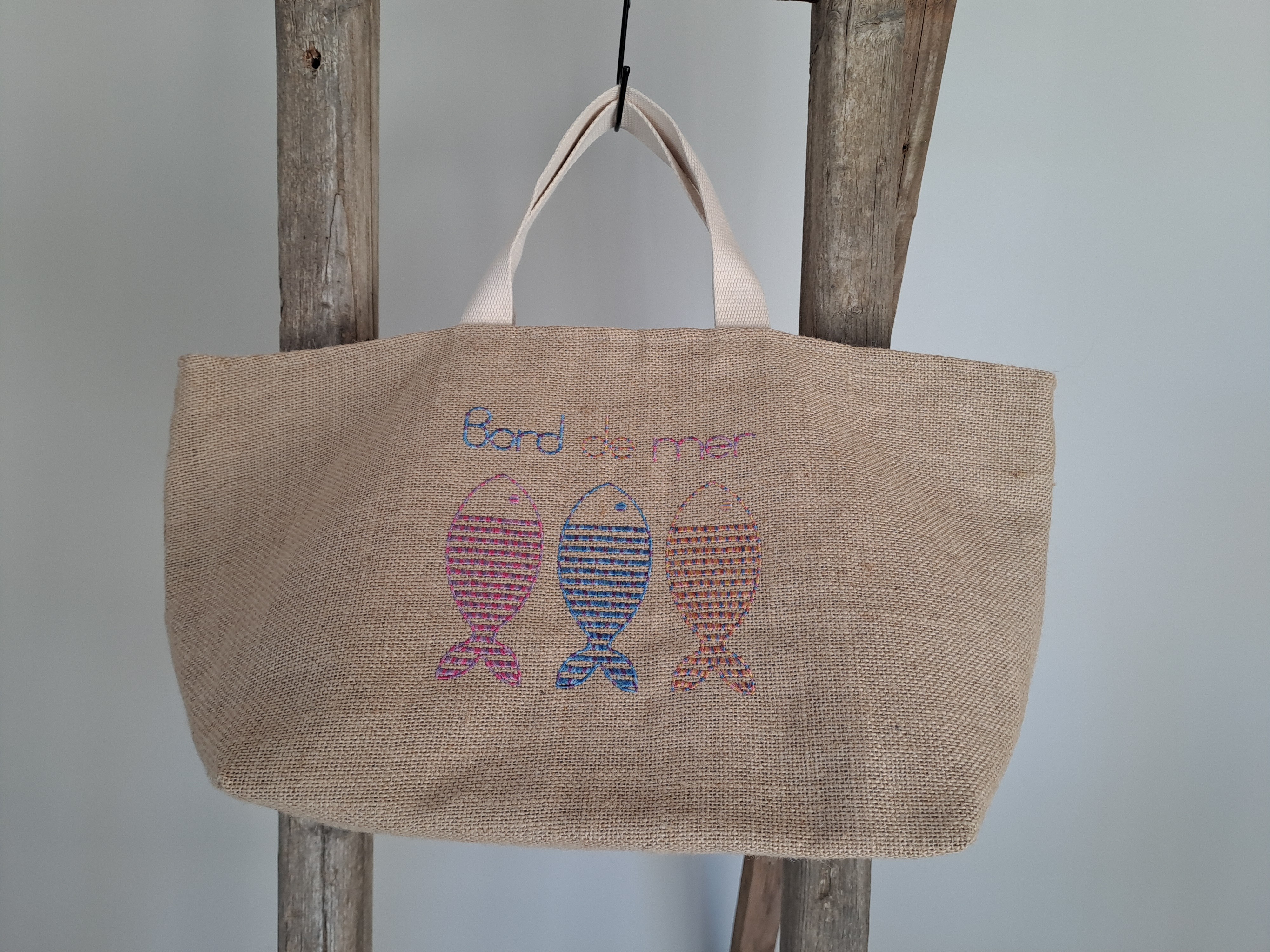 Ca'bois brodé en toile de jute et tissu lin imprimé bord de mer