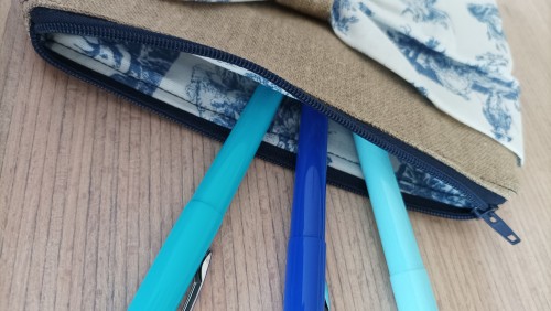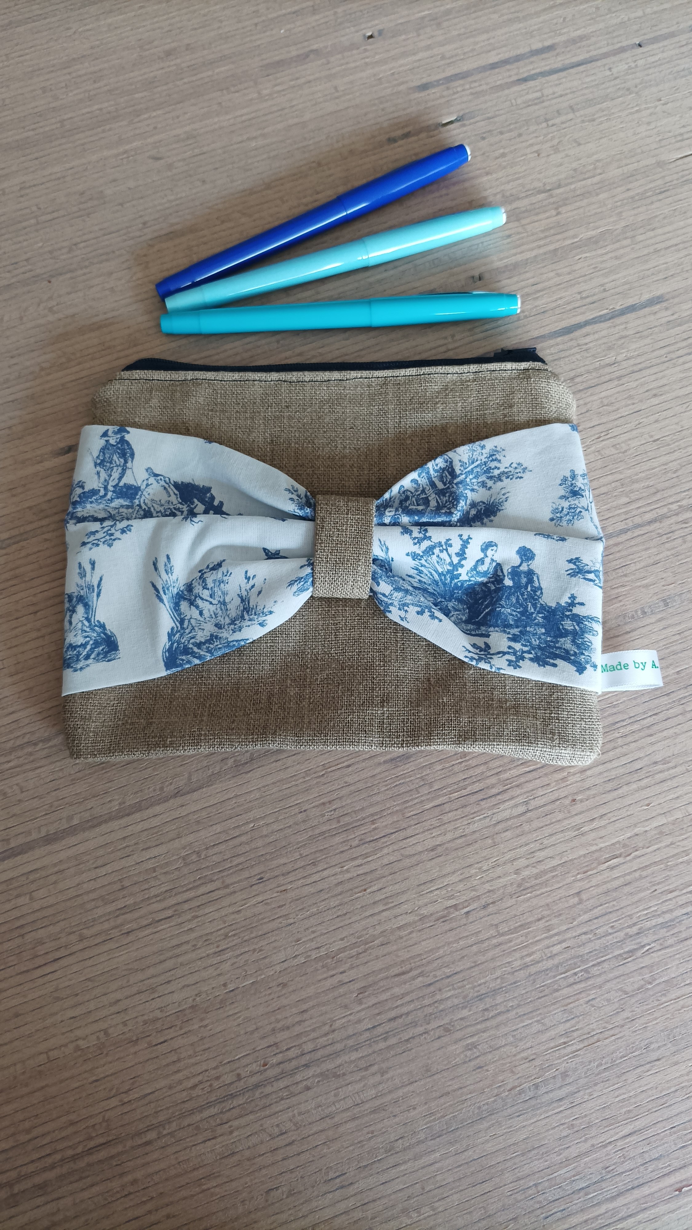 Trousse en toile de lin et toile de Jouy bleu et blanc