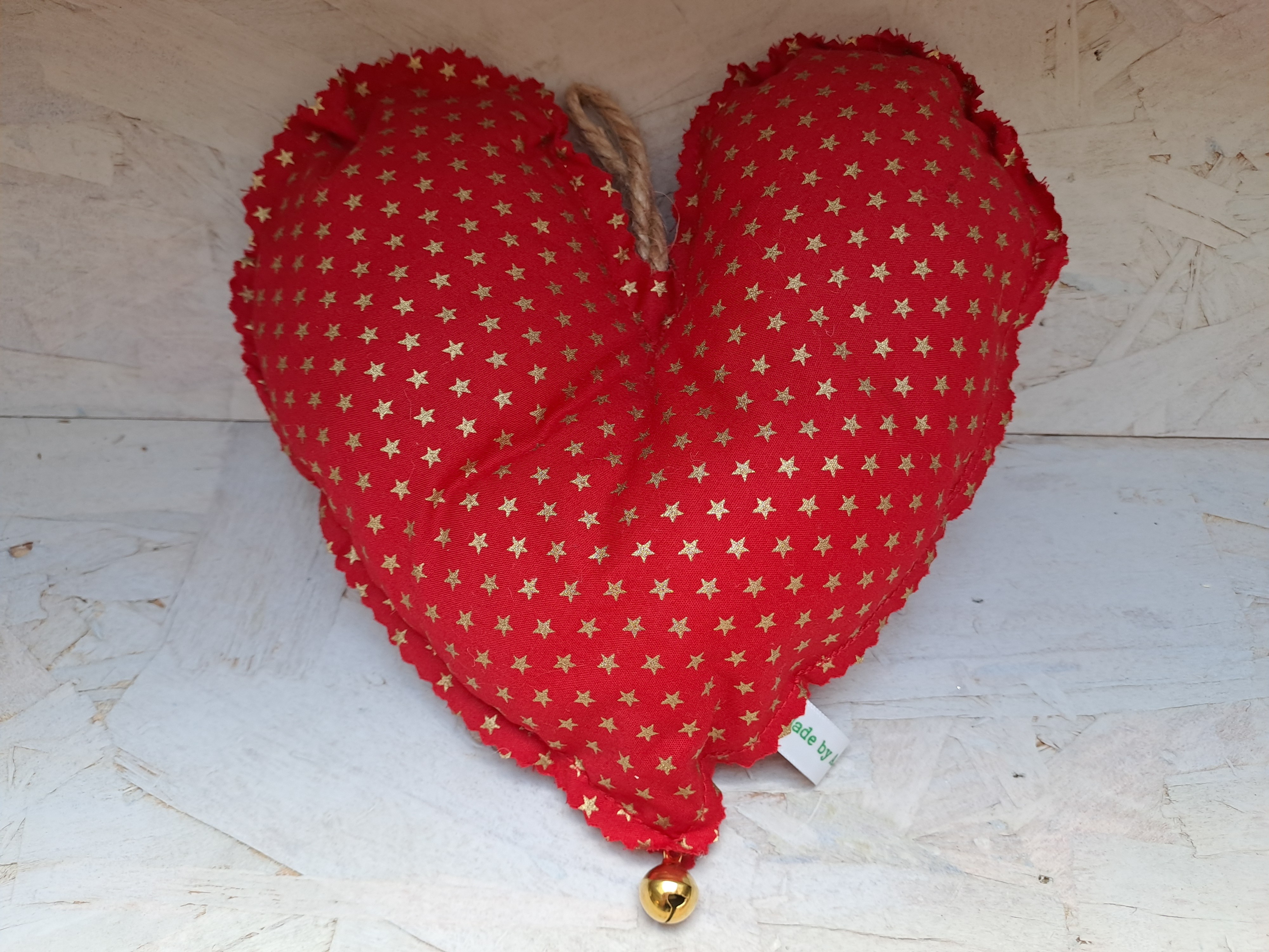 Coeur de Noël avec clochette et corde pour pouvoir le suspendre réalisé en tissu rouge et petites étoiles dorées