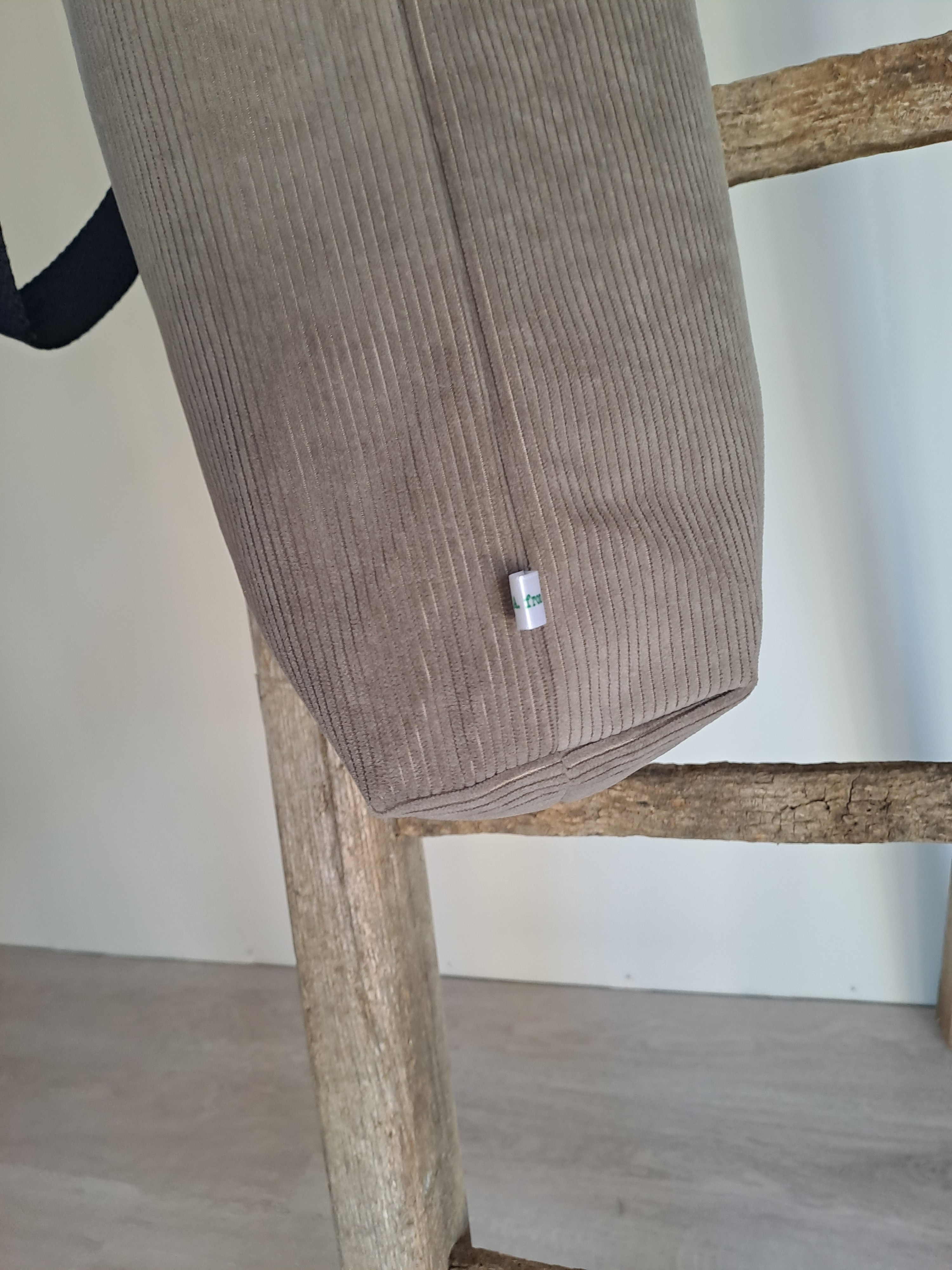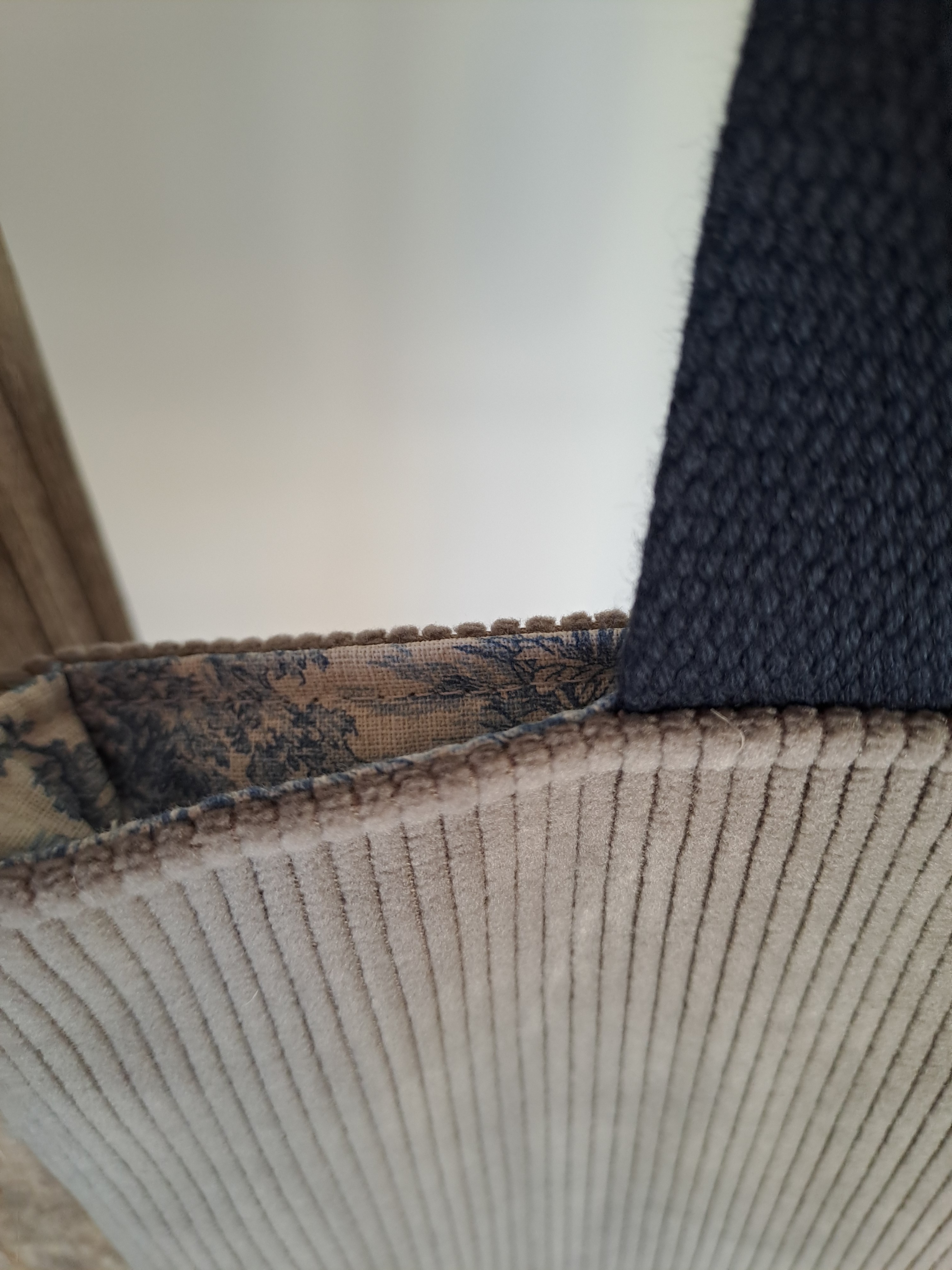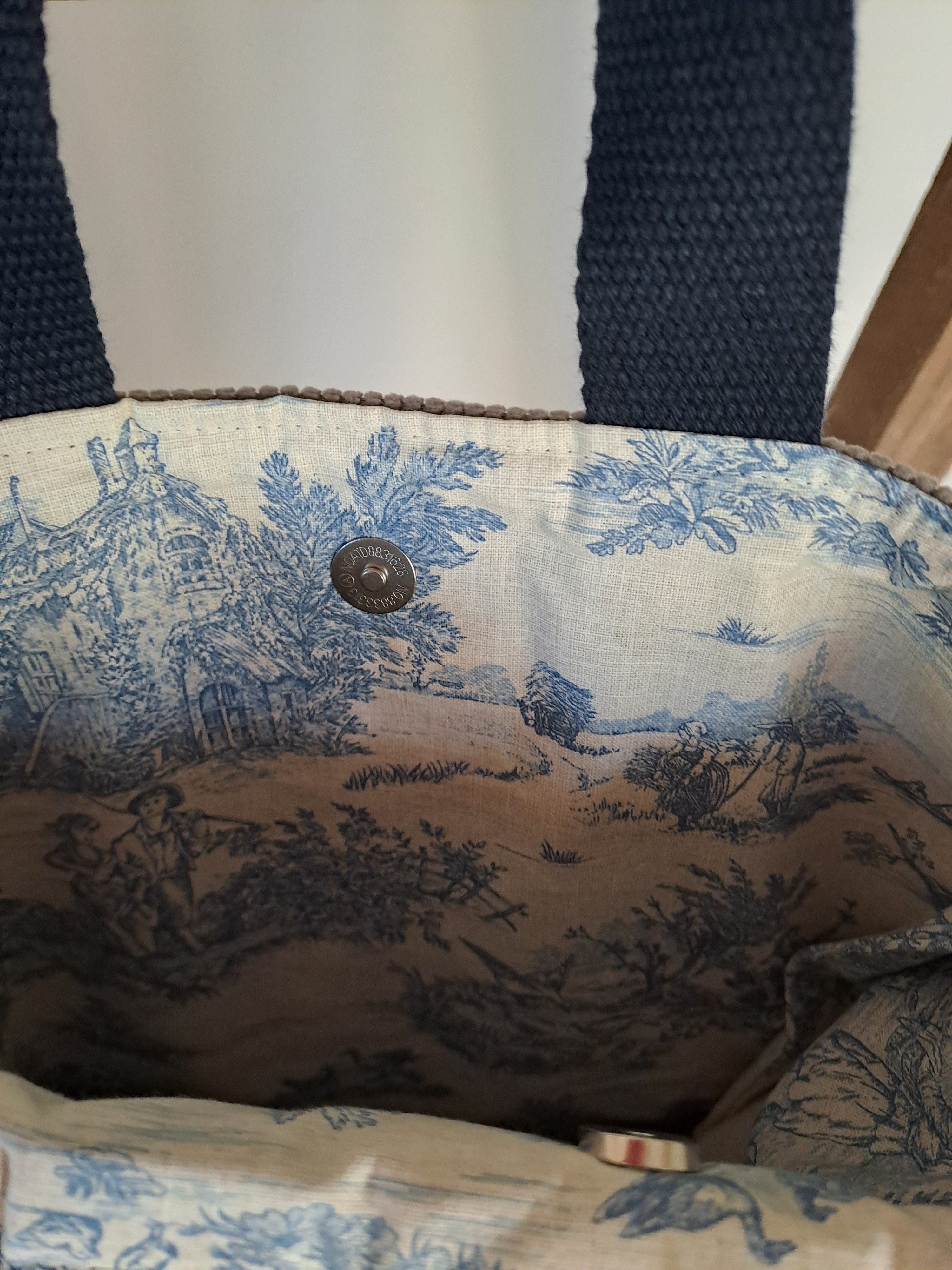 Tote bag réalisé en tissu extérieur velours gris - tissu intérieur en toile de lin impression toile de Jouy bleu