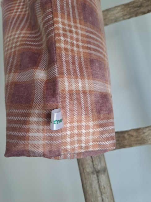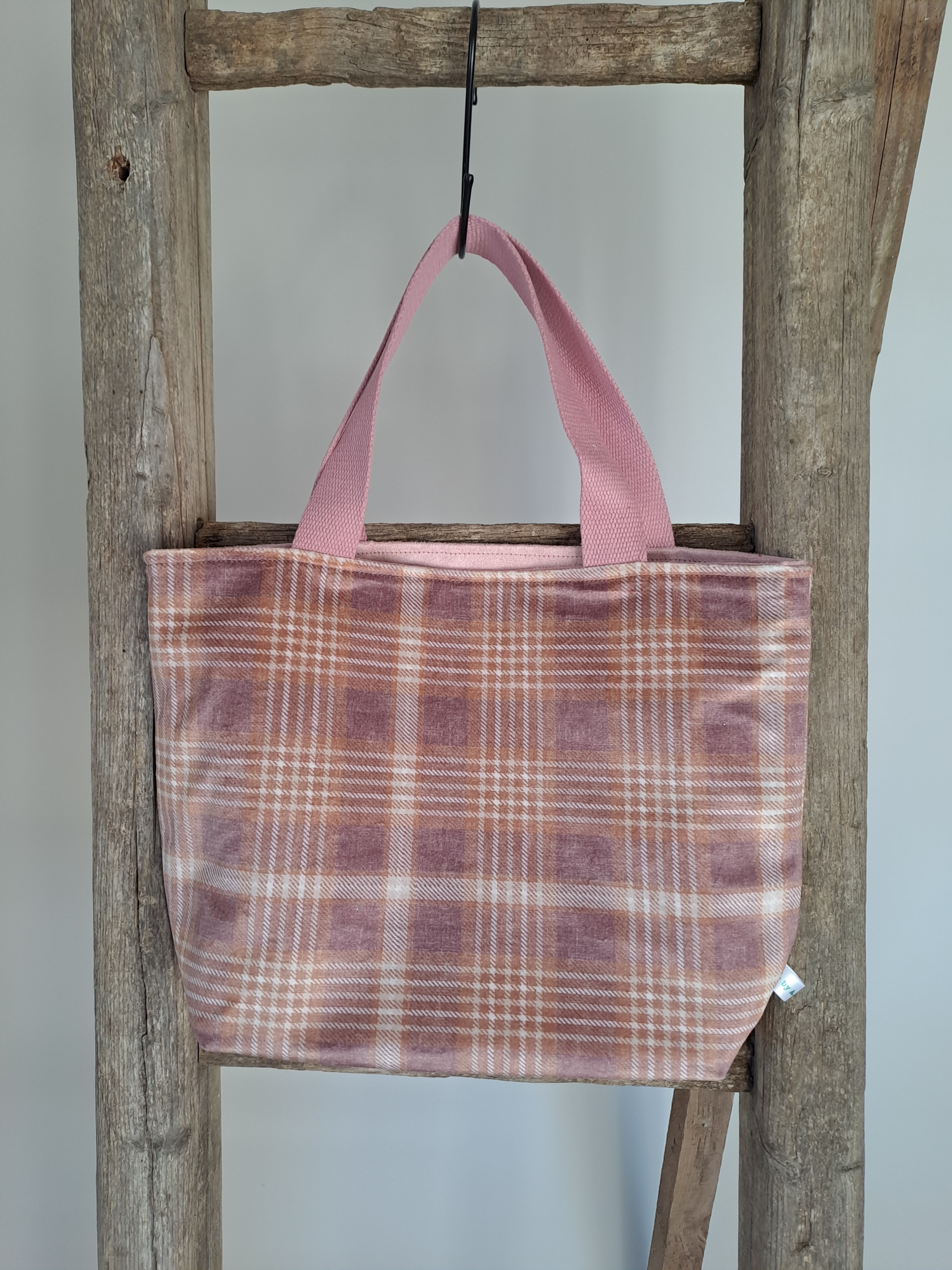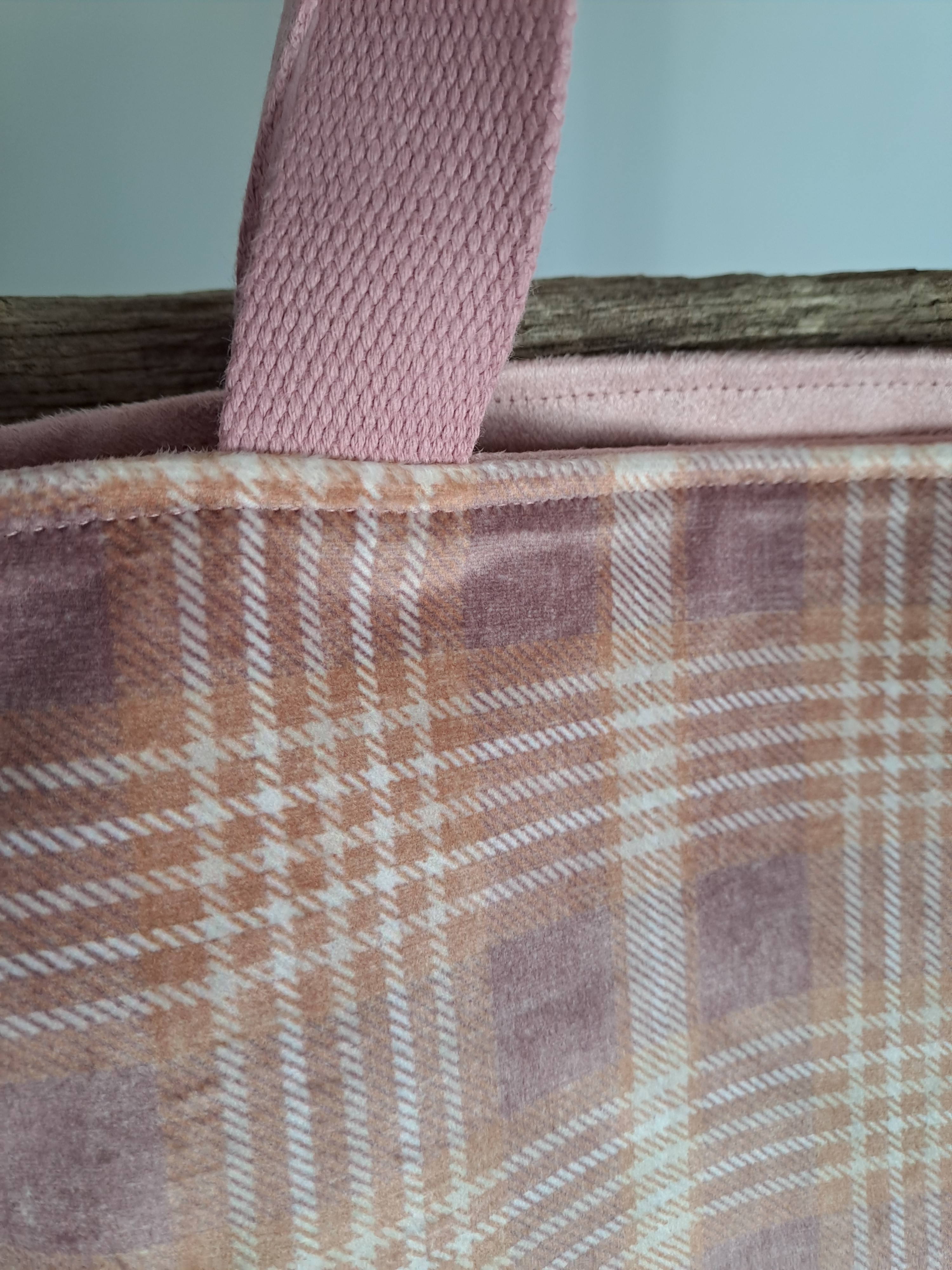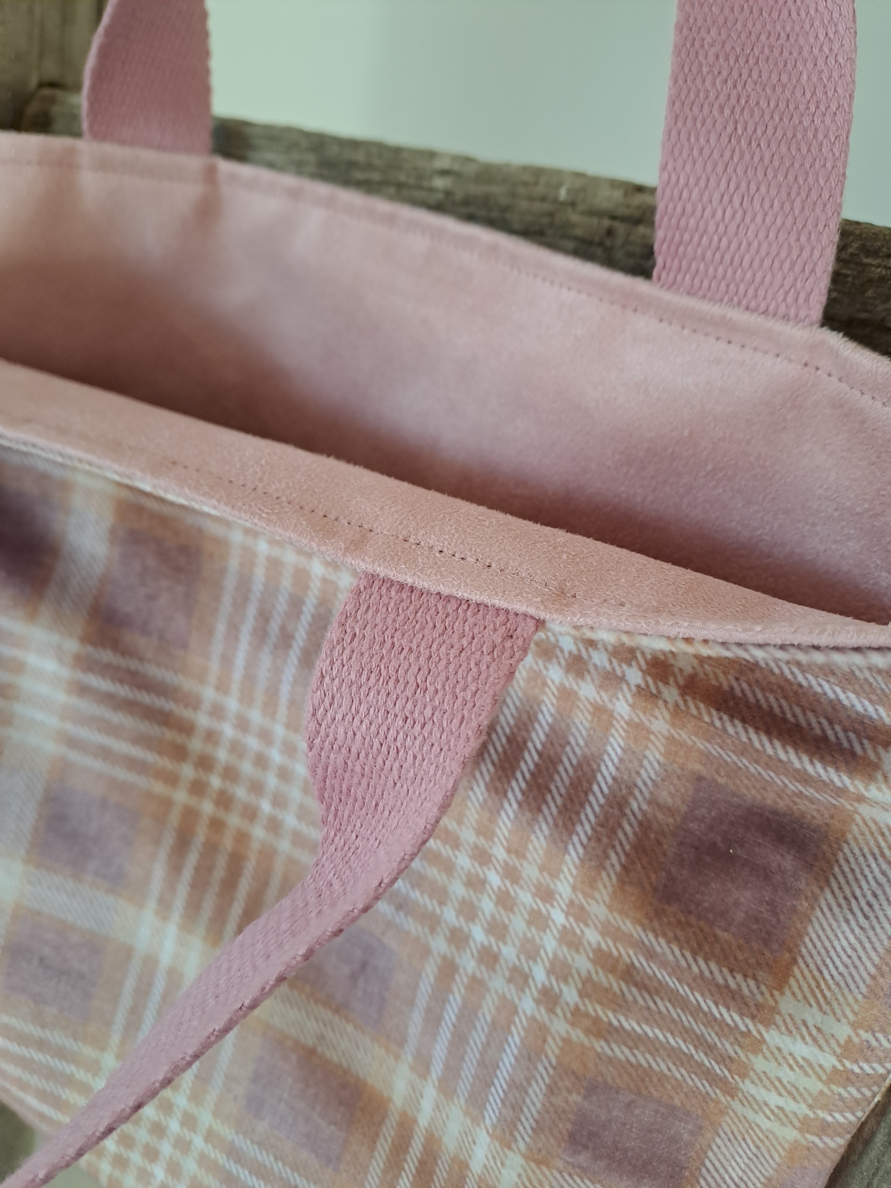 Petit cabas réalisé en tissu extérieur motif tartan velours et tissu intérieur suédine rose