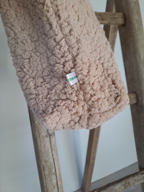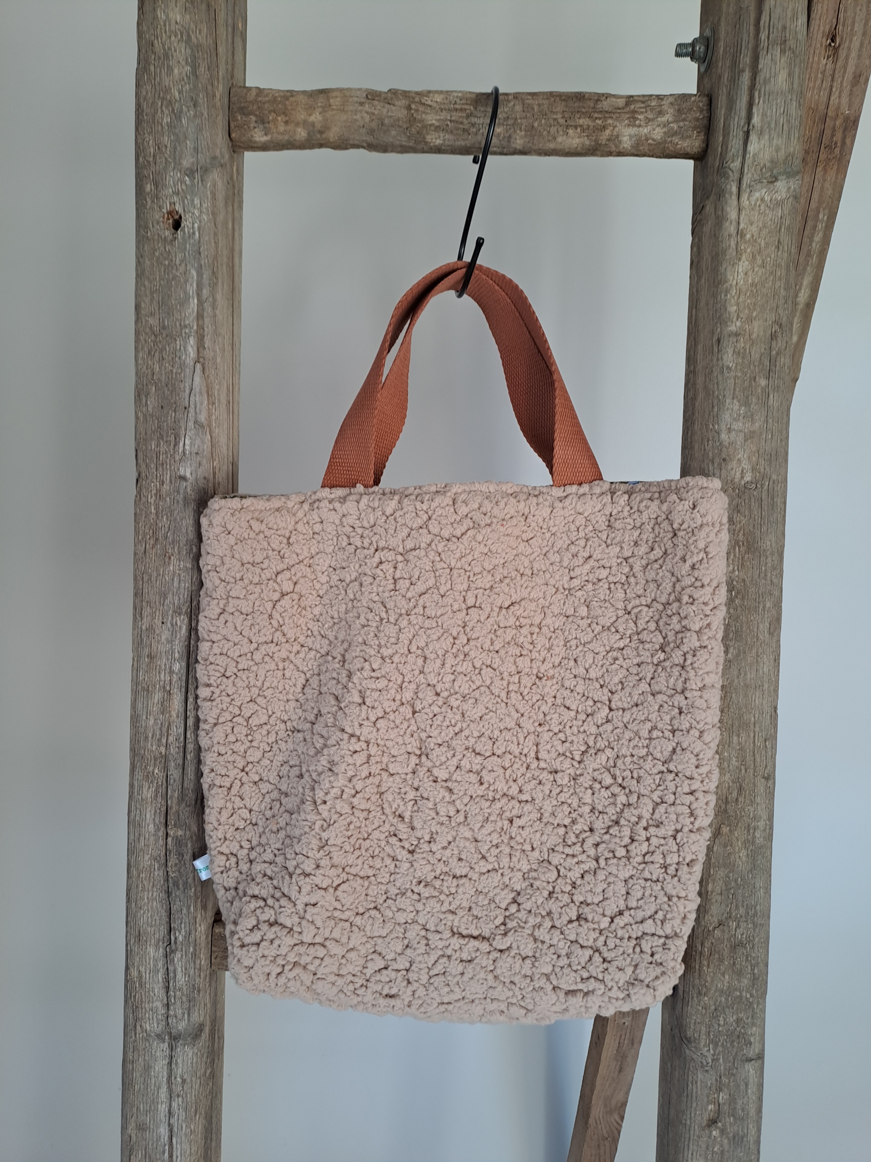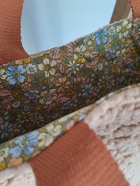 Petit cabas réalisé en tissu sherpa ourson et tissu intérieur fleuri