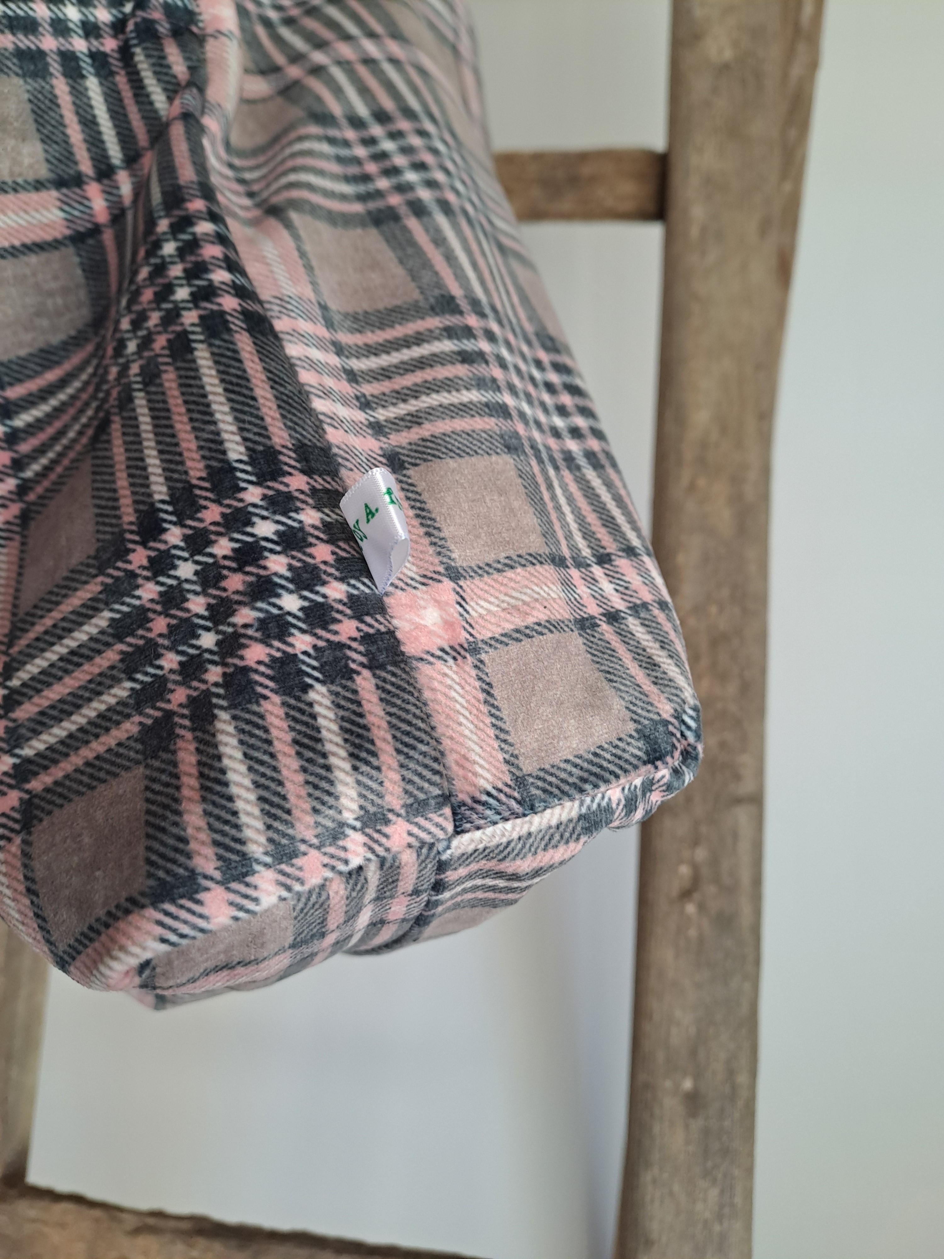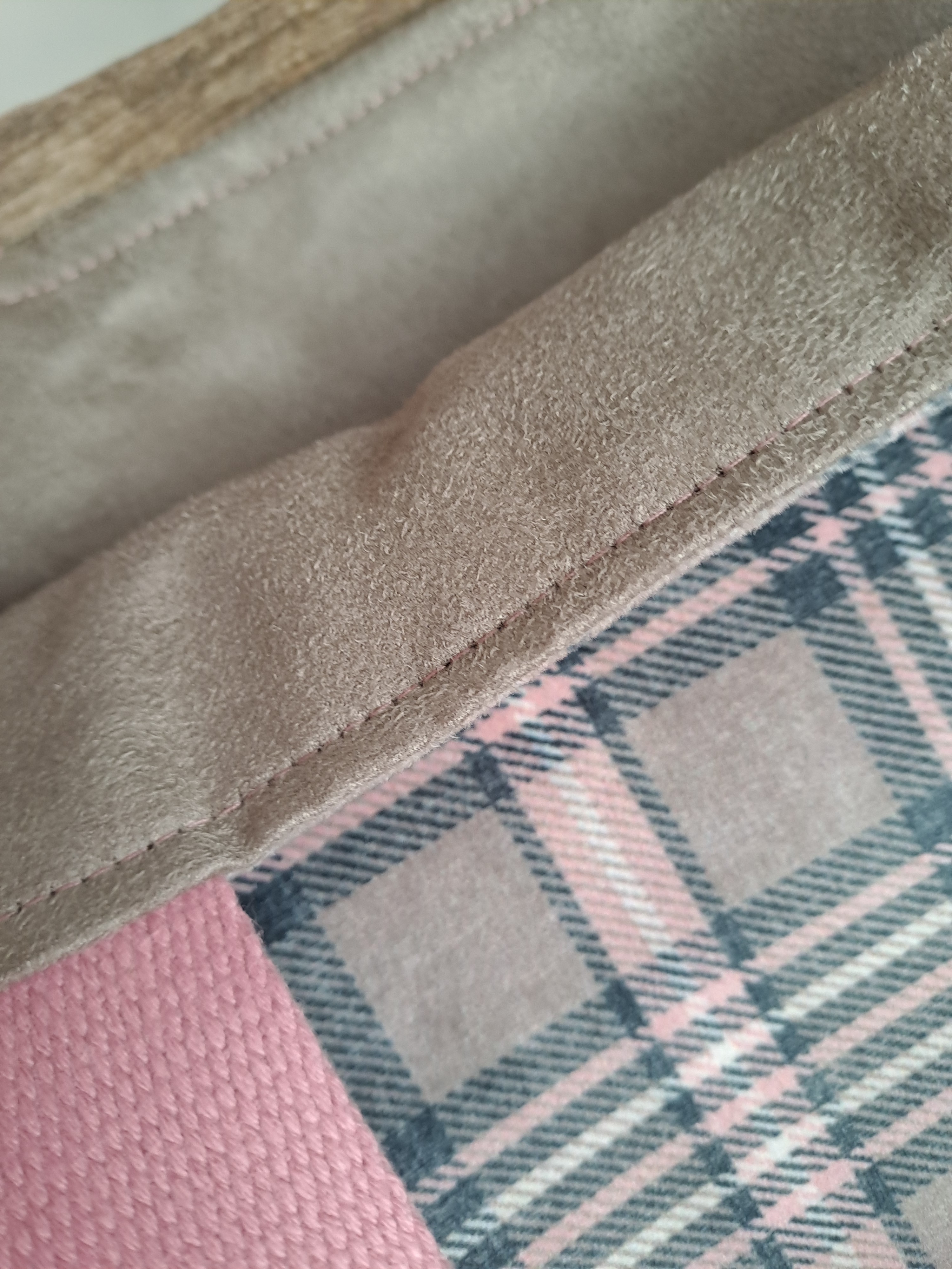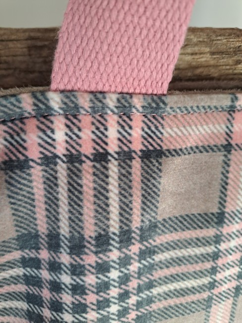 Cabas réalisé en tissu tartan velours taupe et rose avec tissu intérieur en suédine taupe