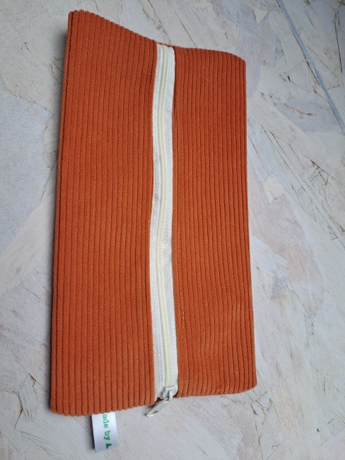 Grande trousse plate en velours côtelé de couleur brique et tissu intérieur fleuri.