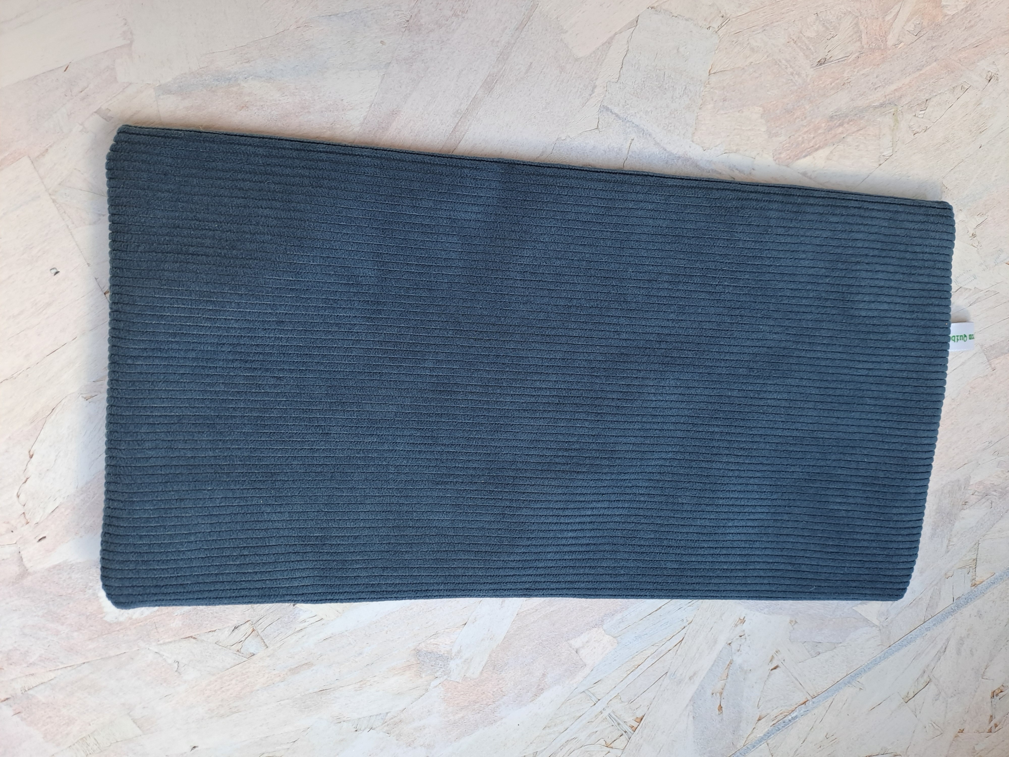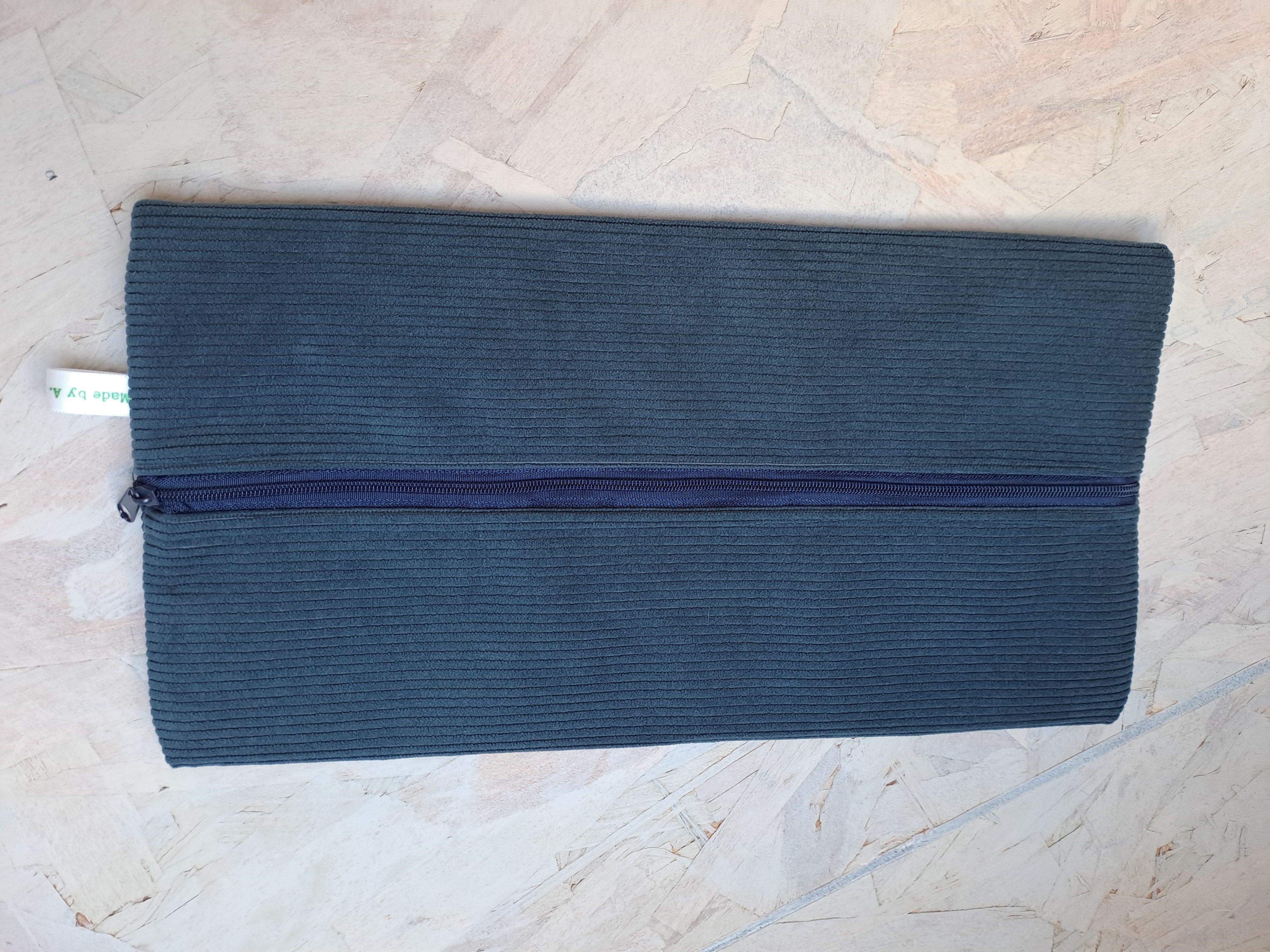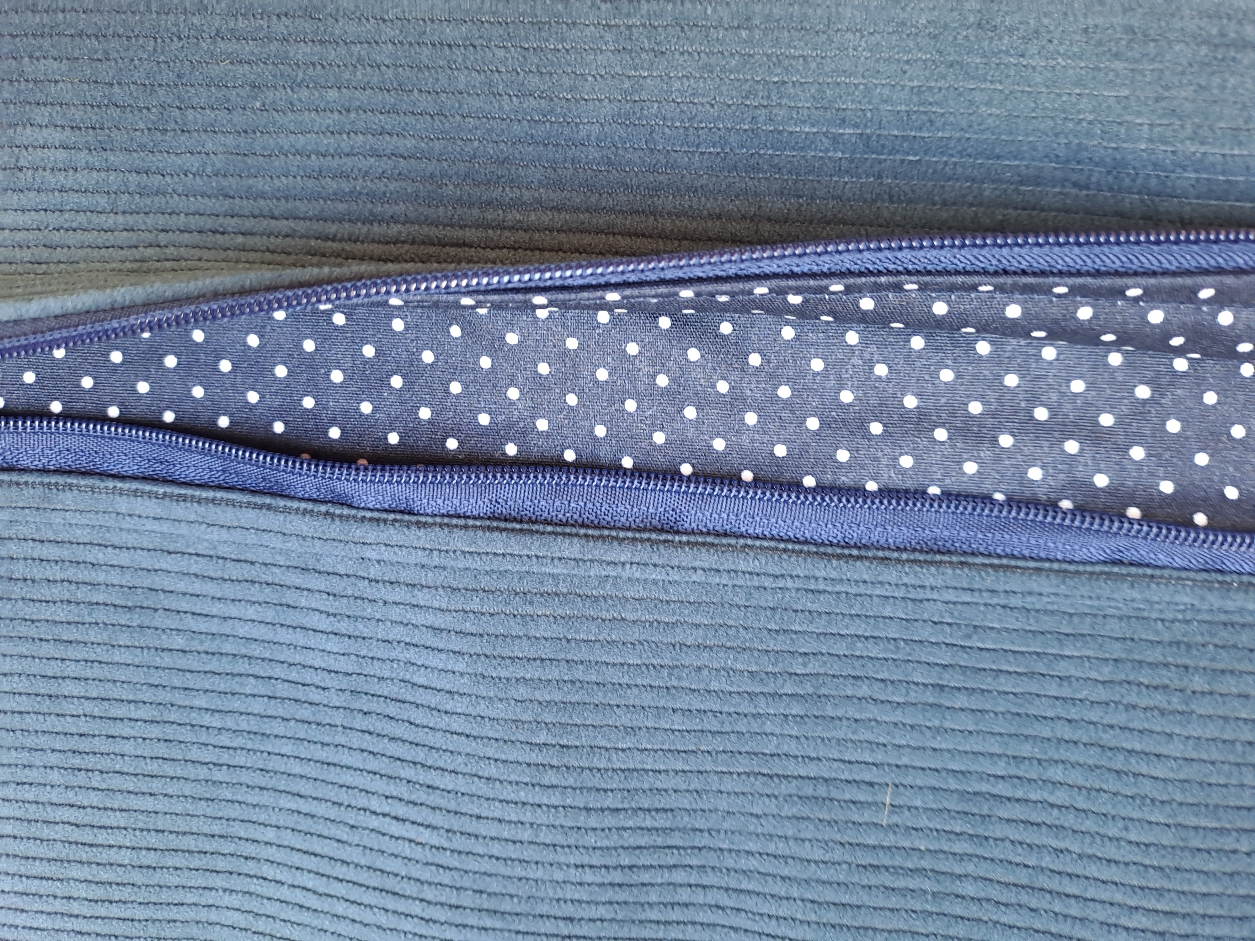 Grande trousse plate en velours côtelé de couleur bleu marine et tissu intérieur marine à pois blancs.