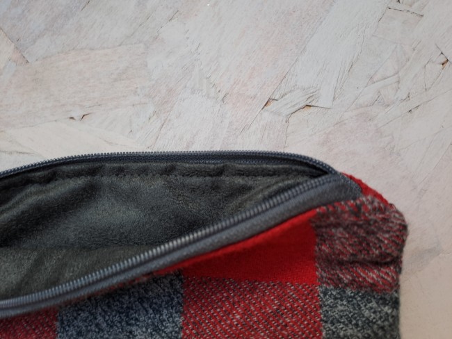 Trousse plate en tissu tartant rouge et gris et tissu intérieur en suédine grise