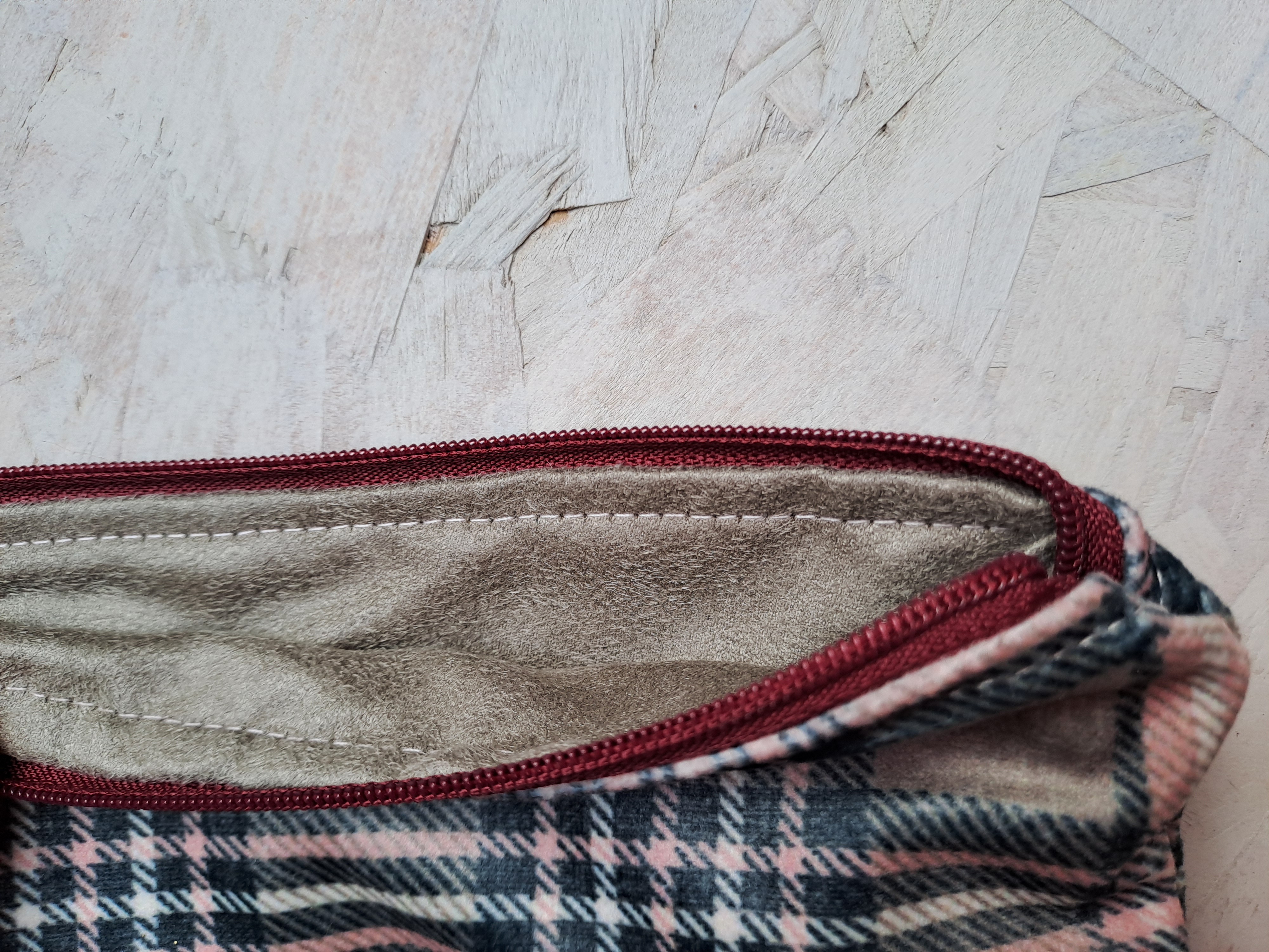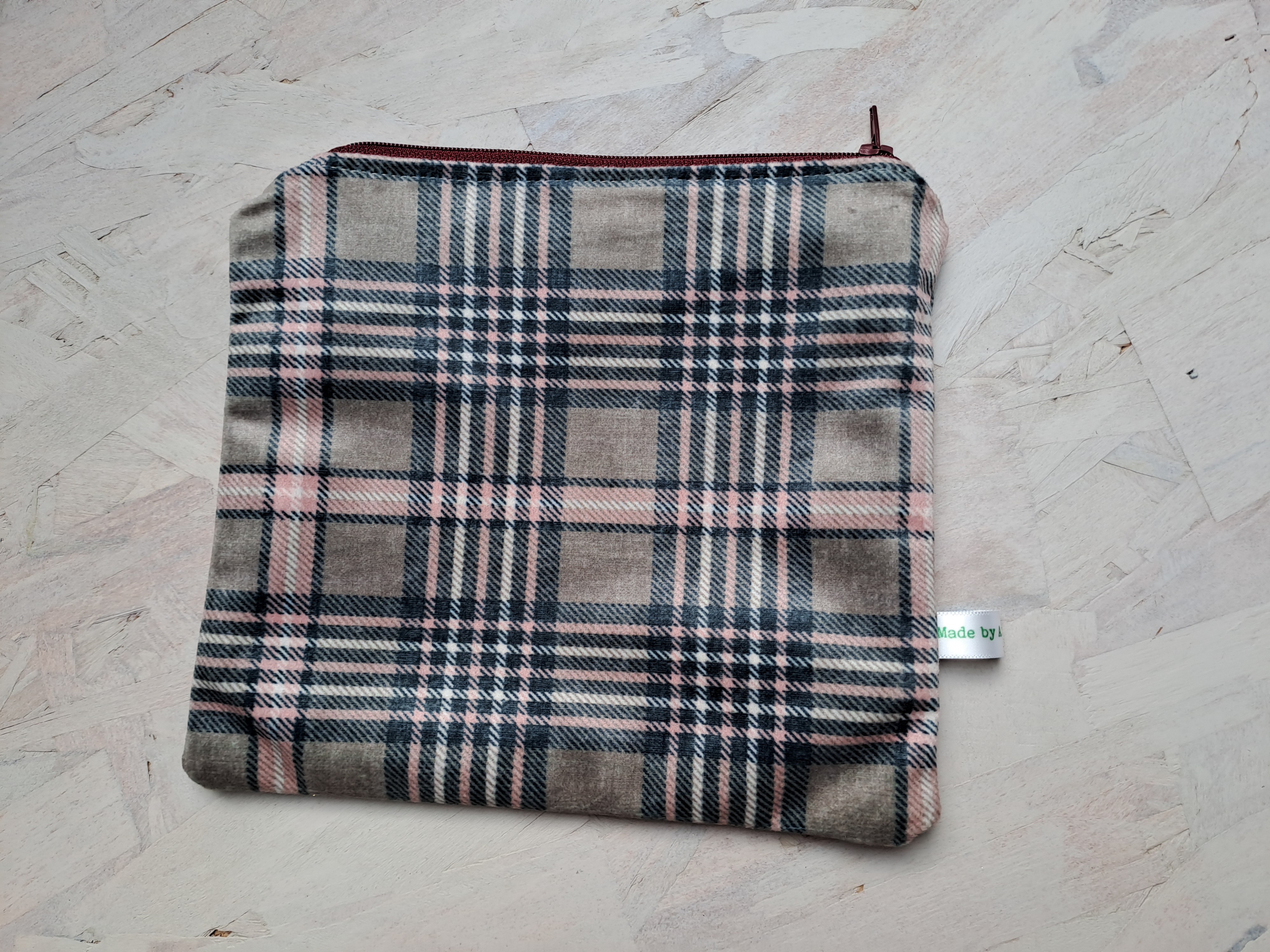 Trousse plate en tissu tartan velours taupe et rose et tissu intérieurs suédine taupe