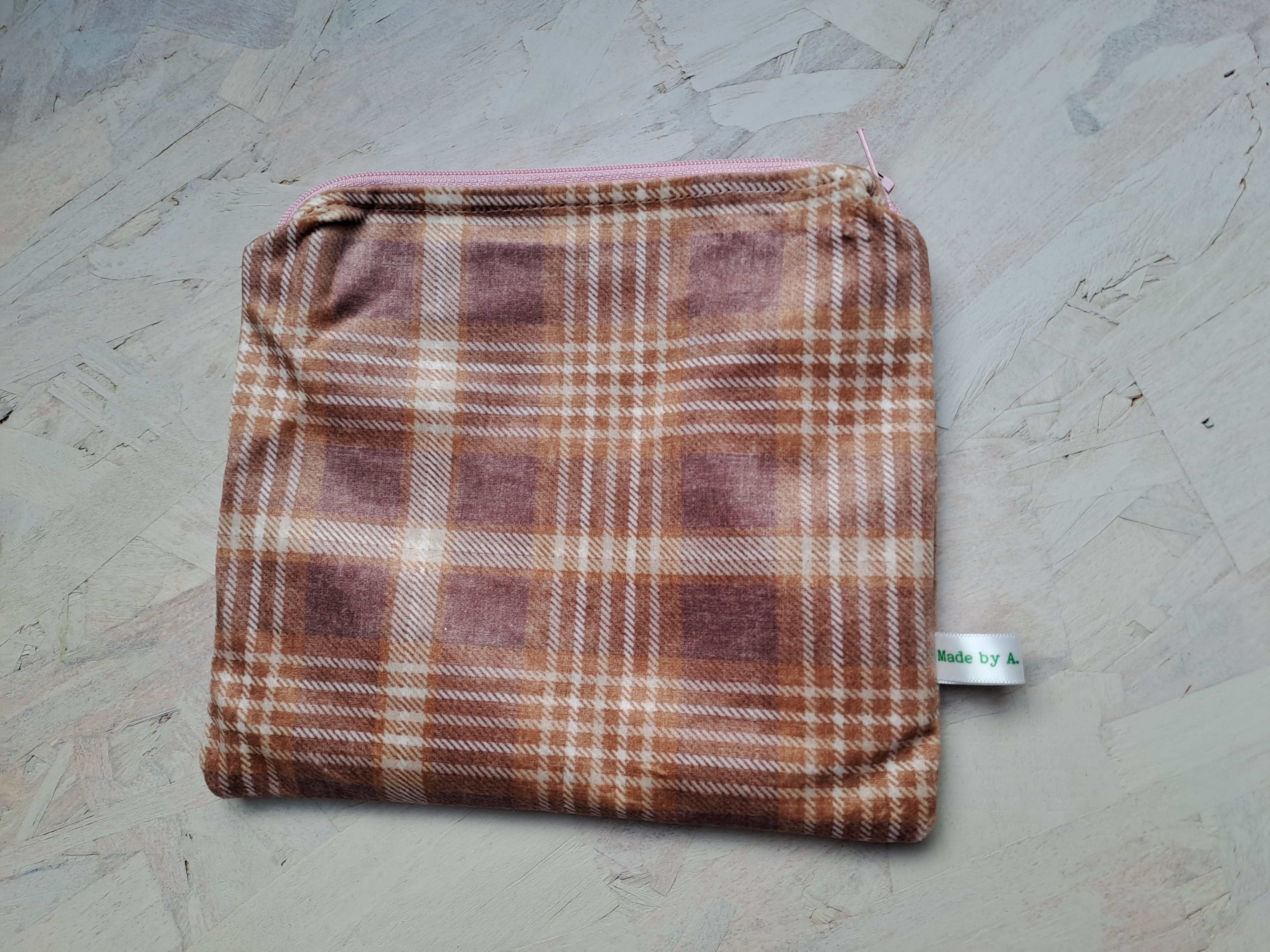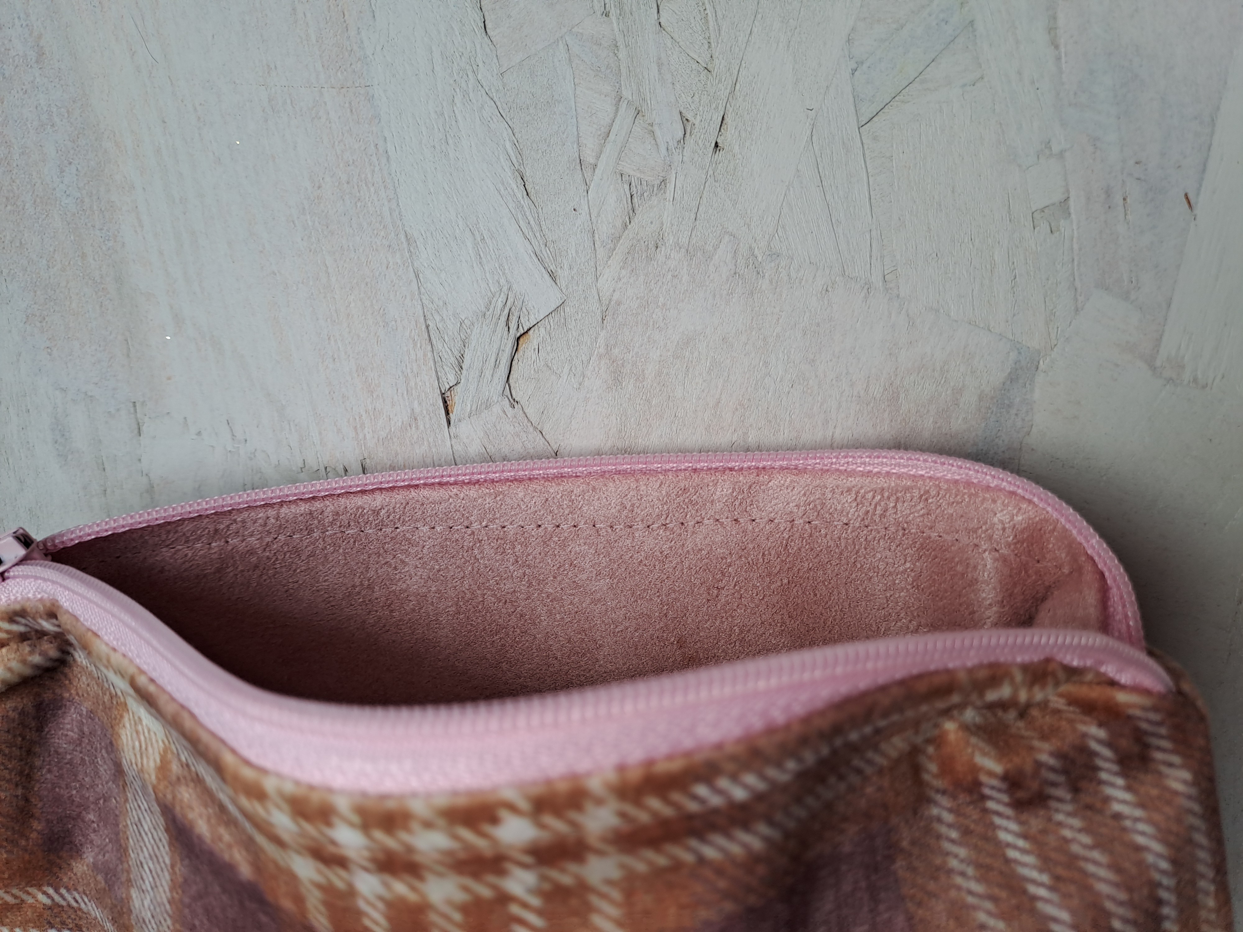 Trousse plate en tissu tartan velours et tissu intérieurs suédine rose