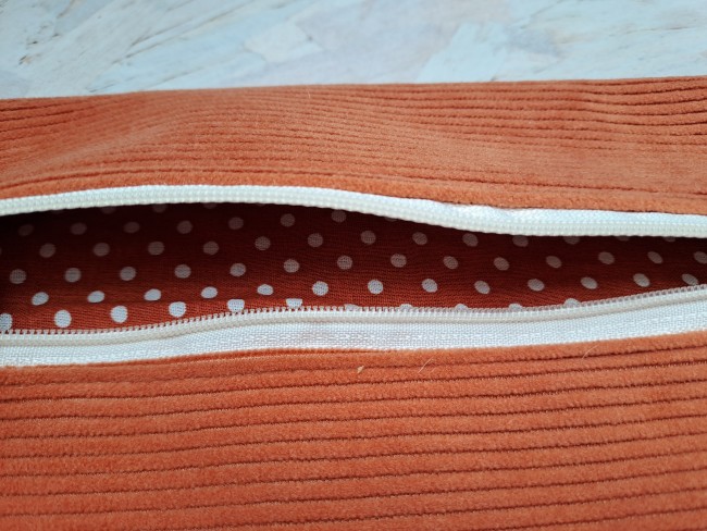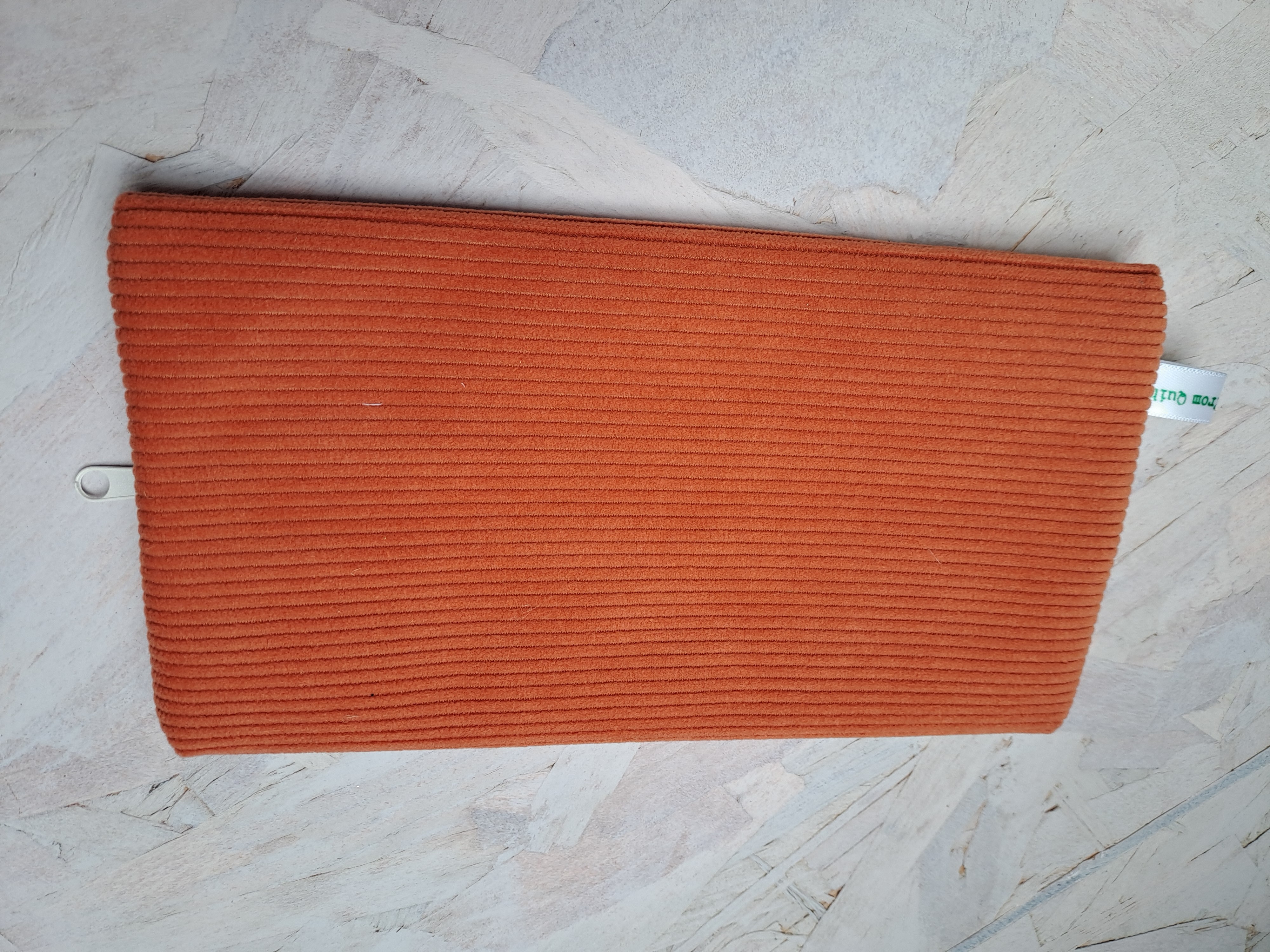 Trousse plate en velours brique et tissu intérieur brique à petits pois blancs