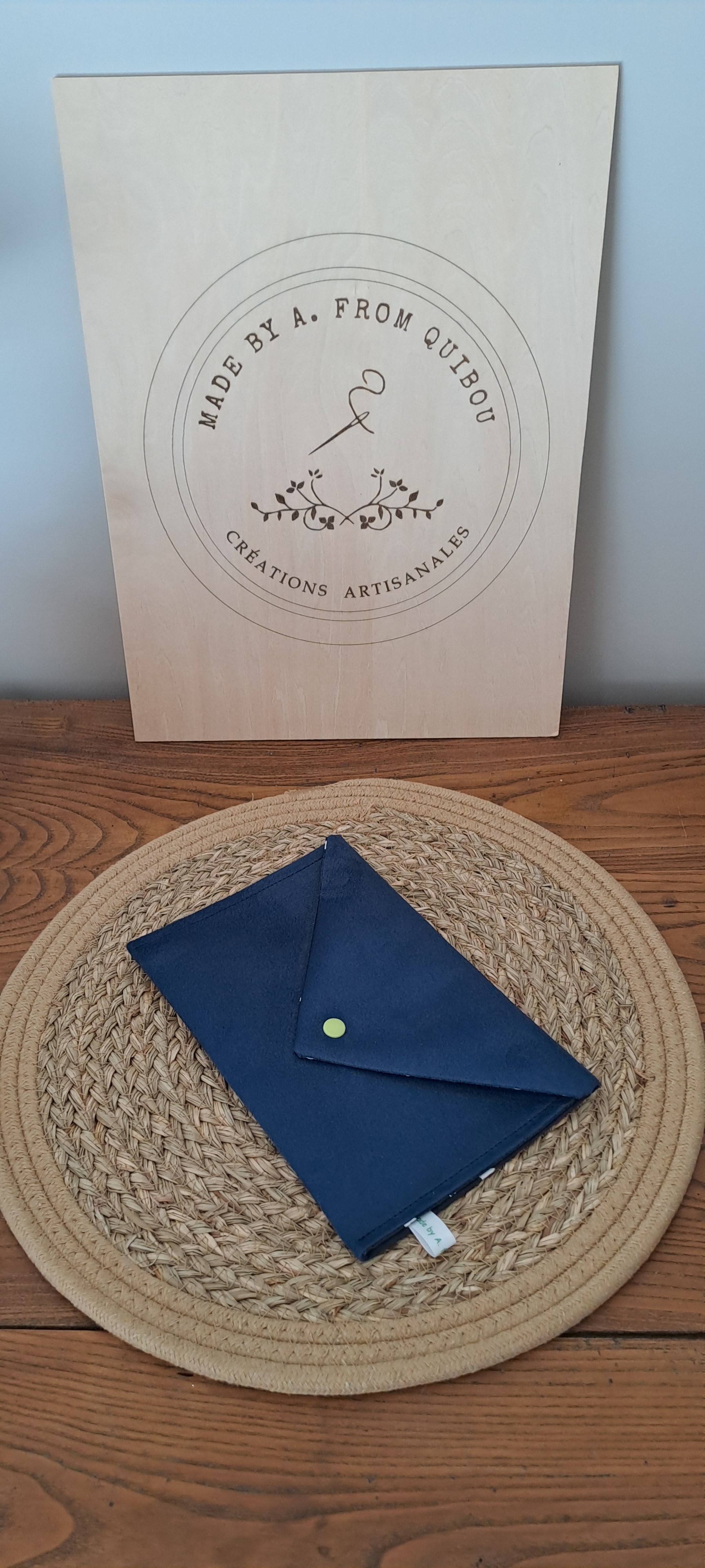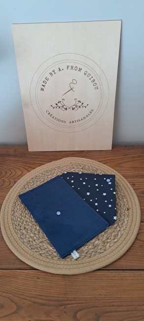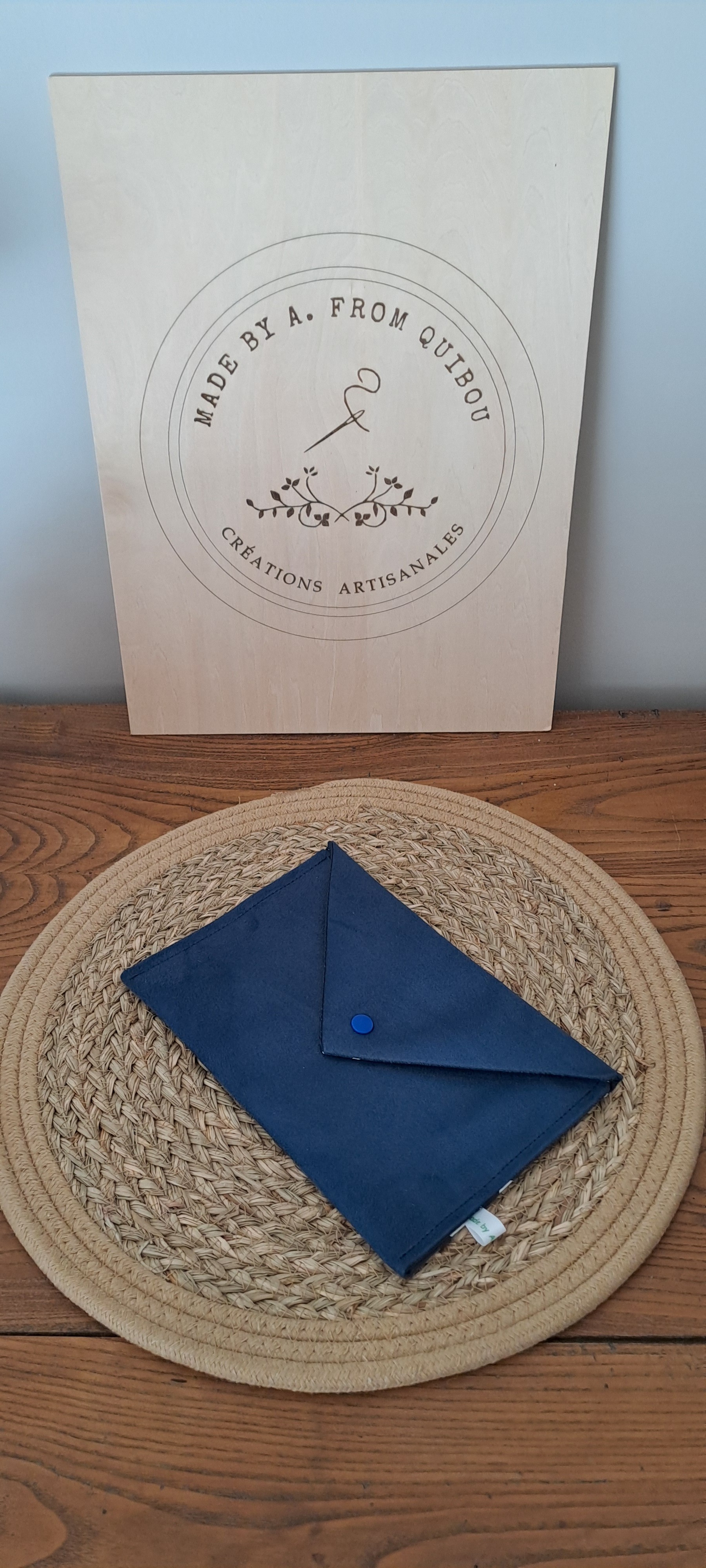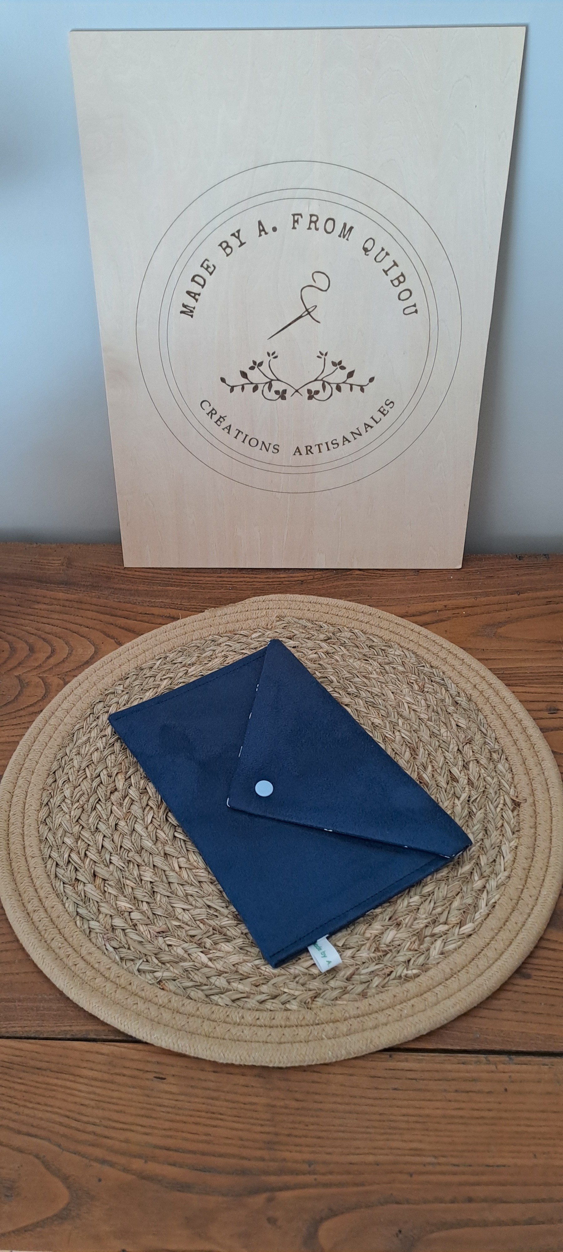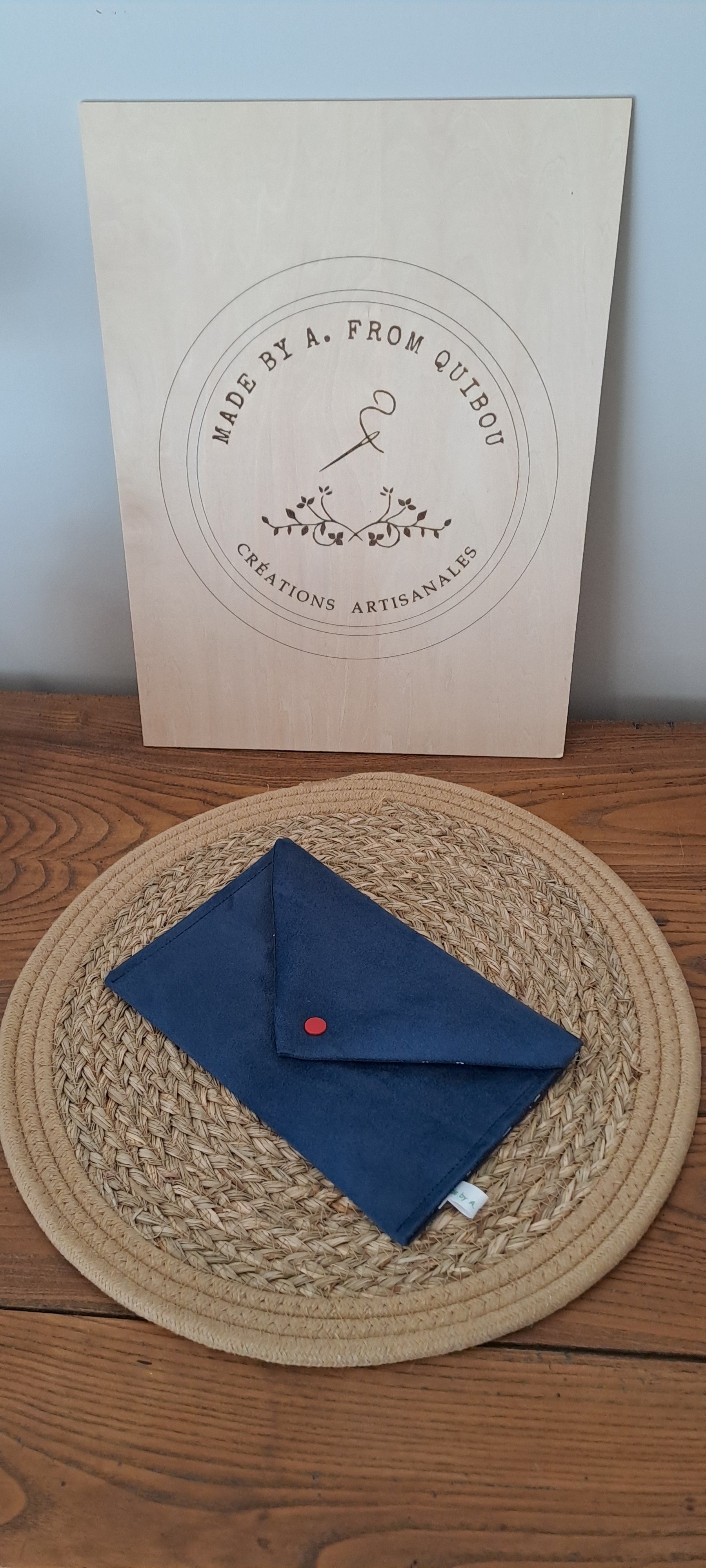 - Tissu extérieur: La pochette est confectionnée dans un tissu suédine de couleur bleu marine.