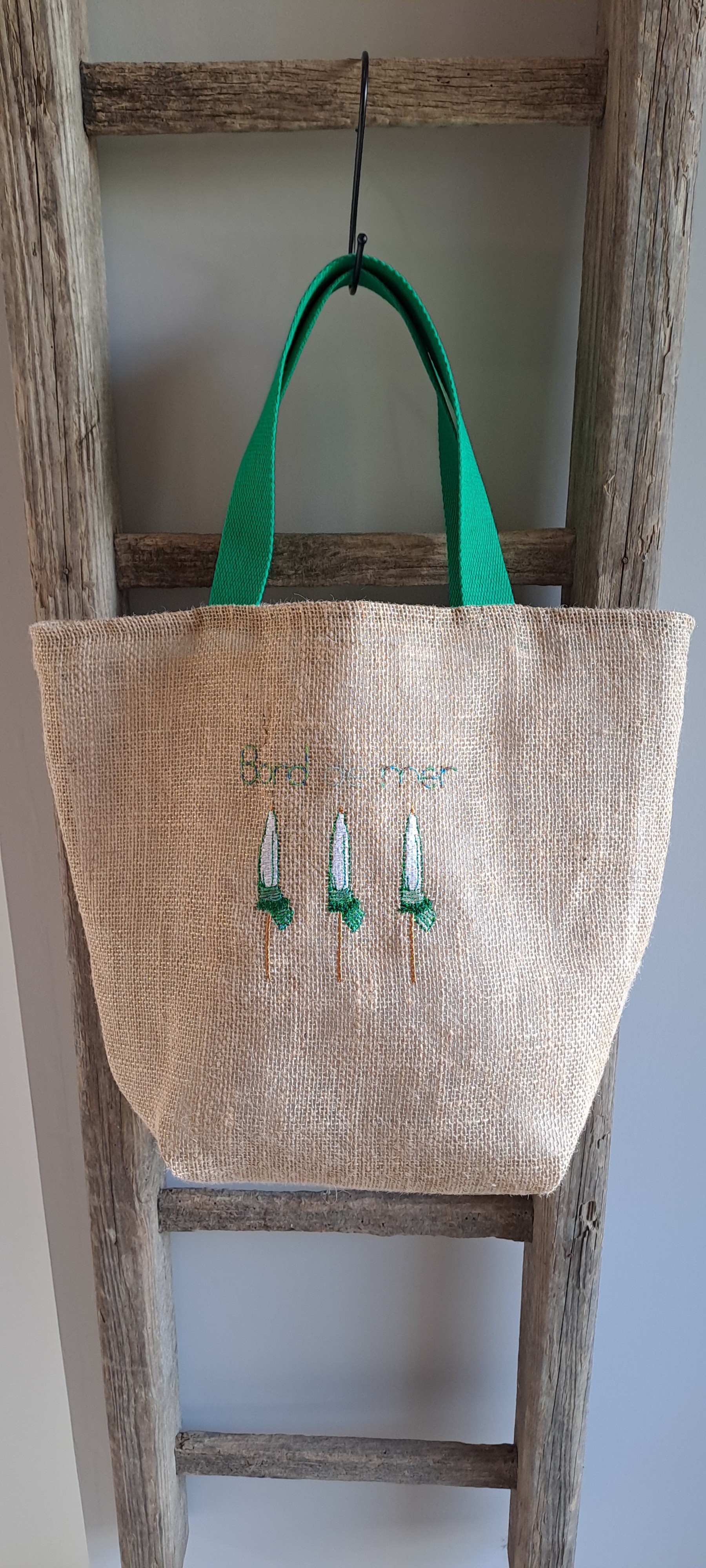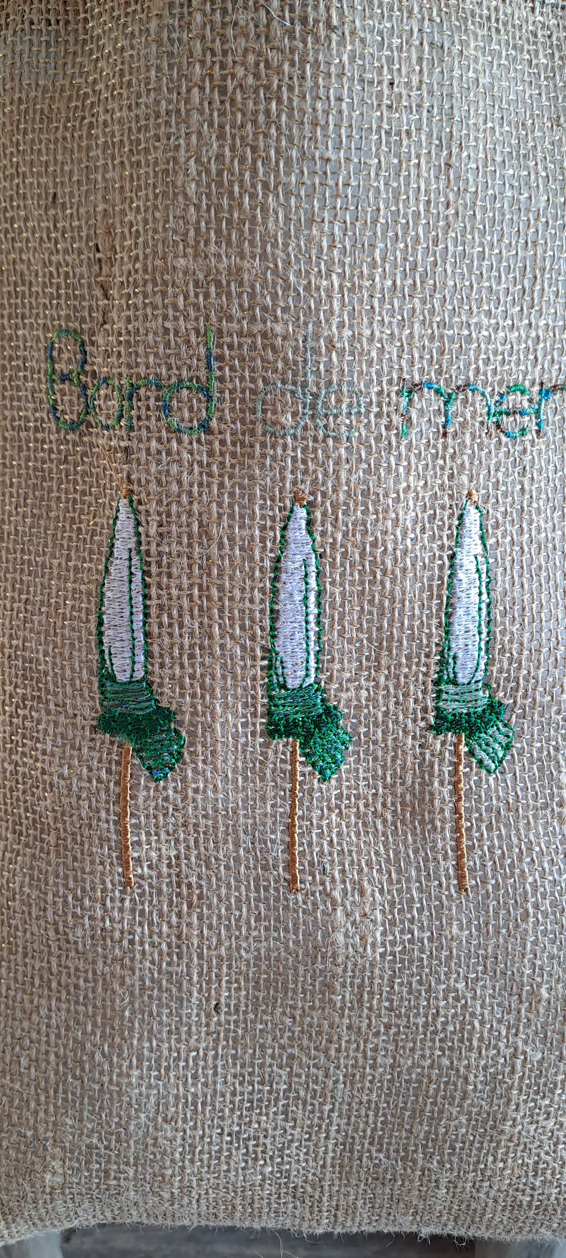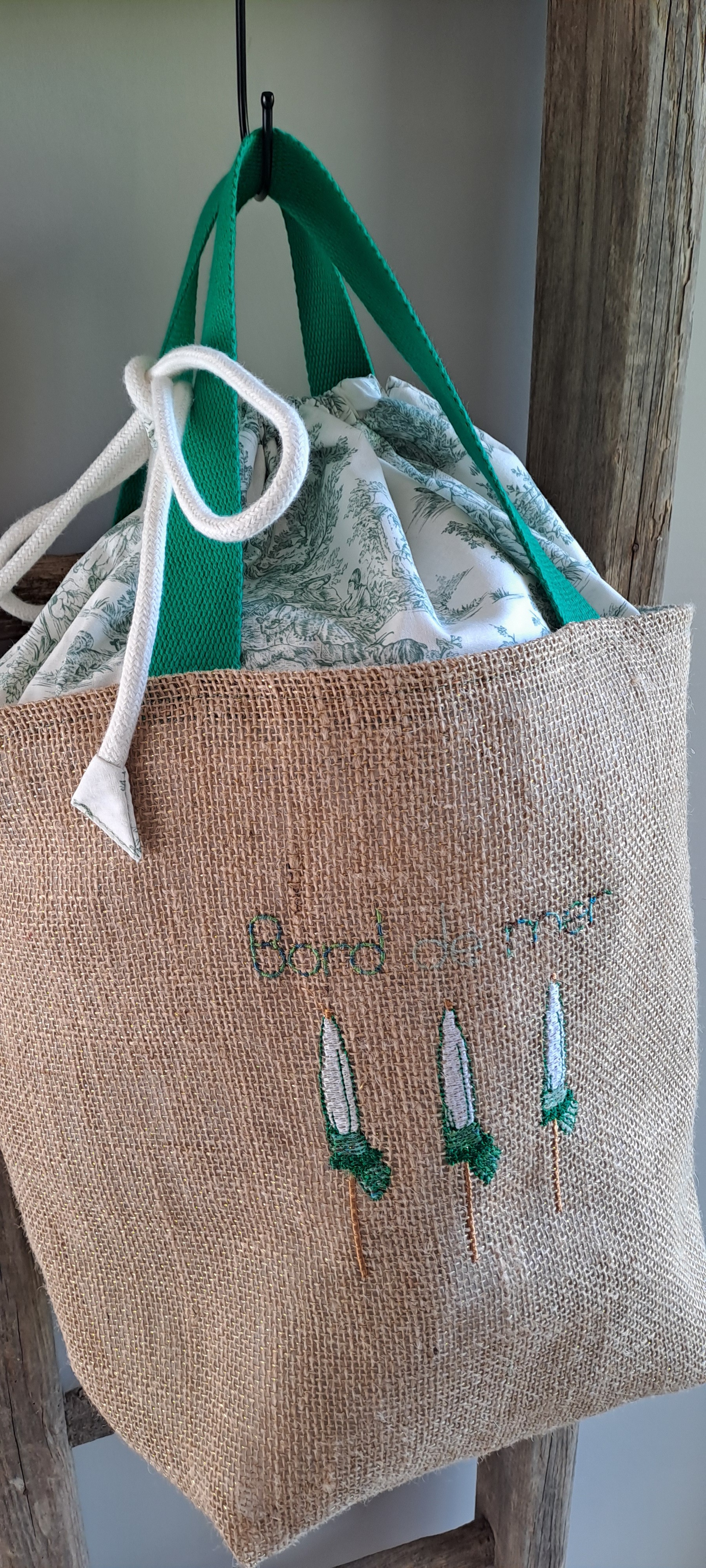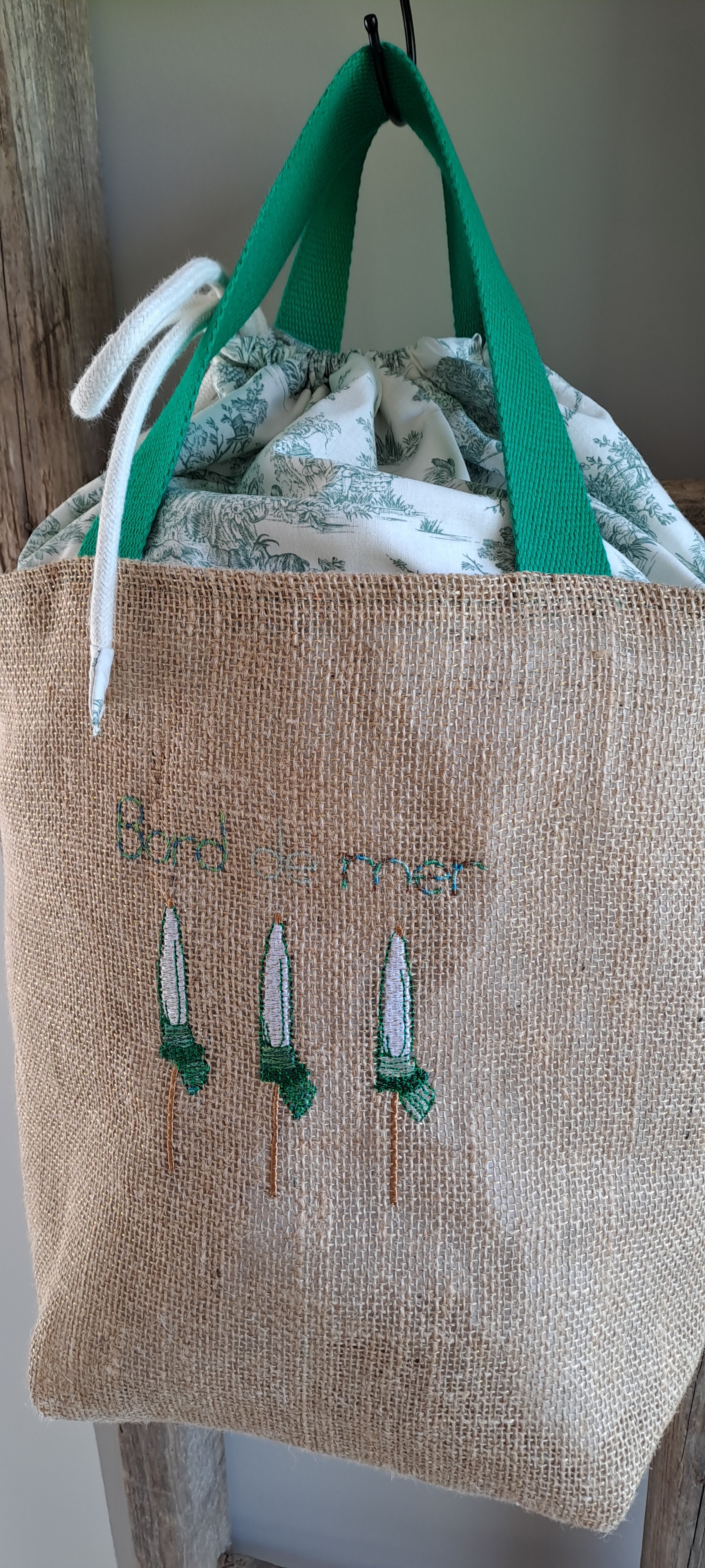 Détails Brodés : La face avant est ornée de la broderie délicate "Bord de mer", accompagnée de motifs végétaux stylisés en fil vert, rappelant l'univers marin et végétal.