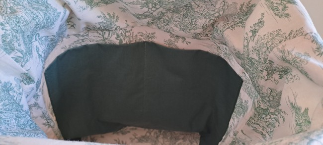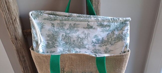 Intérieur Raffiné : Le sac révèle une doublure intégrale en Toile de Jouy verte. Ce tissu classique aux motifs bucoliques apporte une touche de noblesse et de fraîcheur dès qu'on l'ouvre.