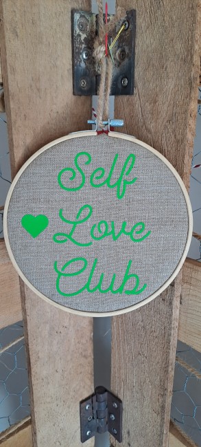 Sur un tissu en lin, le message "Self Love Club" s'affiche fièrement en couleur vert fluo.