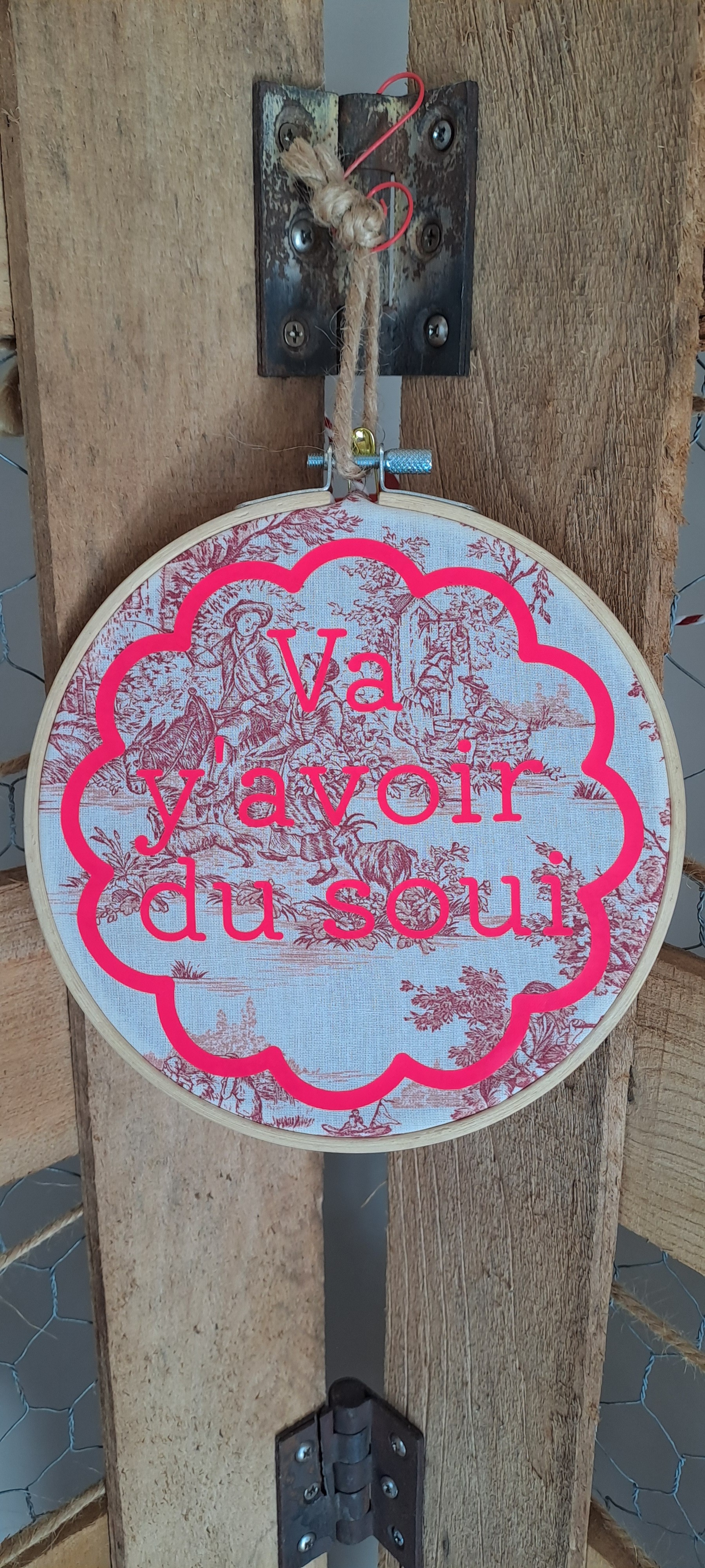 Sur un tissu toile de Jouy rose, le message "Va y'avoir du soui" s'affiche fièrement en couleur rose fluo.