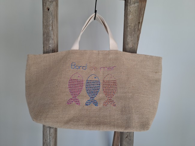 Ca'bois en toile de jute brodé " Bord de mer" et tissu blanc petits poissonsCa'bois Brodés